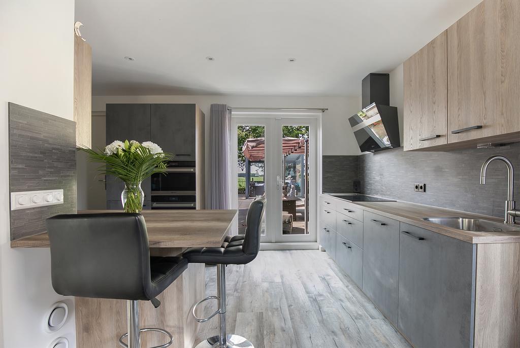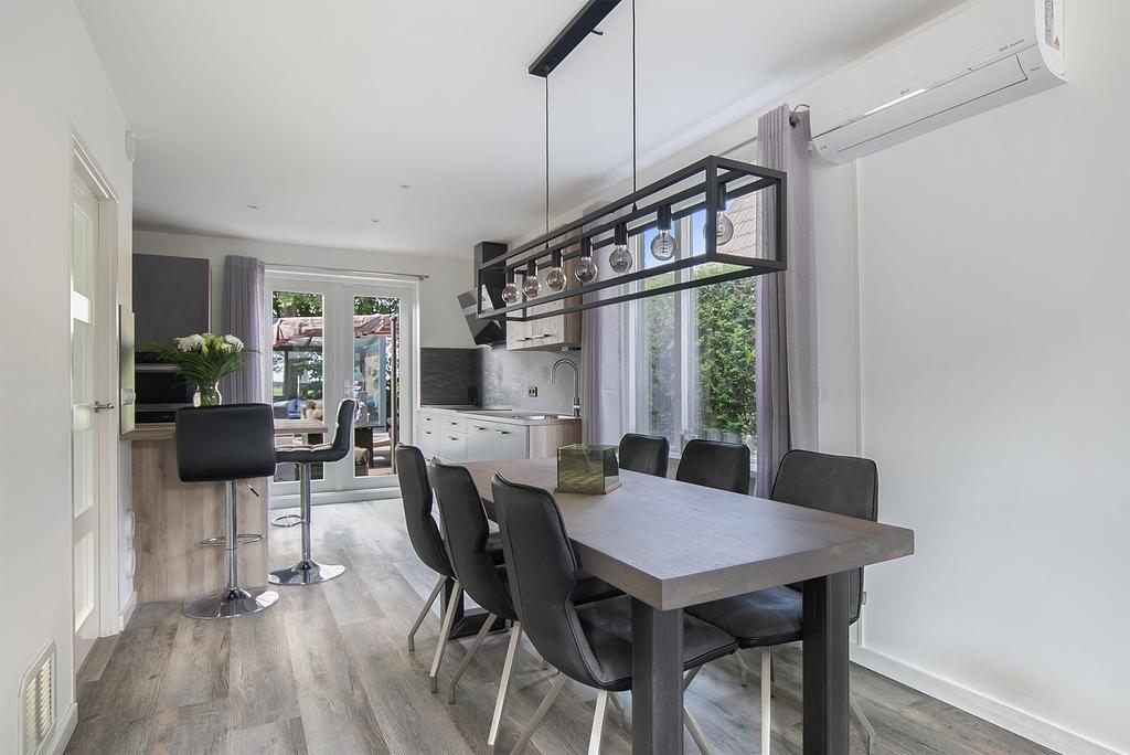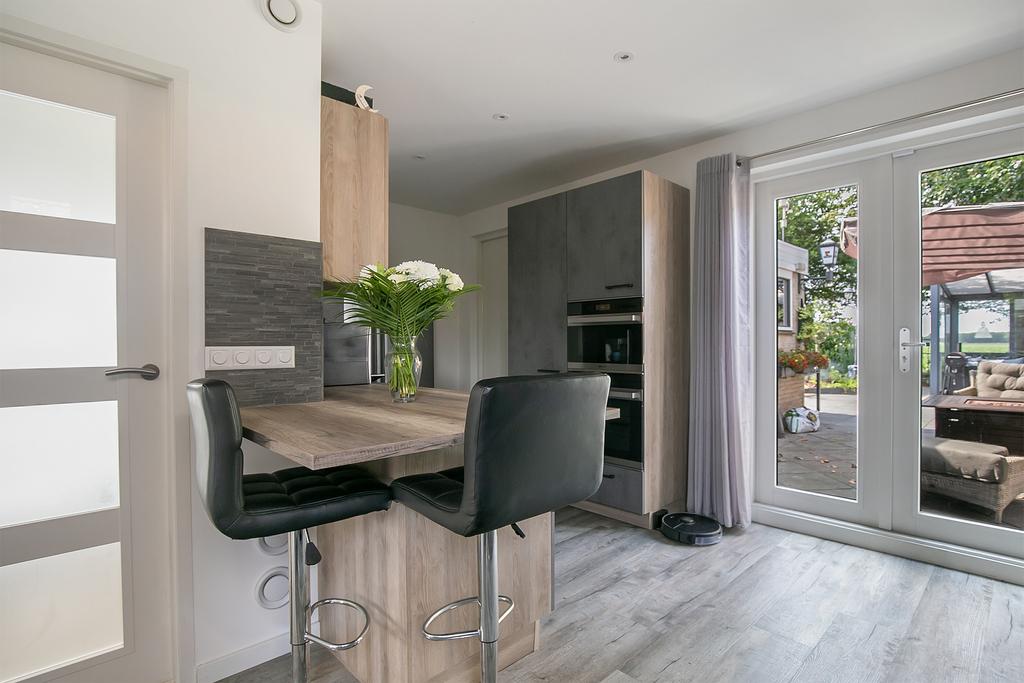 Om bij de voordeur te komen loopt u via de grote oprit – waar u makkelijk twee auto’s kwijt kan – voorbij de voortuin. Bij betreding van deze woning treft u een ruime entree met directe toegang tot de trap, meterkast, een apart toilet en een wastafel. Het toilet is stijlvol betegeld in een verfijnde donkere- en lichtgrijs patronen. De begane grond biedt een open leefruimte waarin de woonkamer, eetkamer en keuken harmonieus in elkaar overvloeien (living and dining). De woonkamer is smaakvol met lichte wanden een luxe grijze pvc vloer en een los staande pellet kachel. De strakke grijze accenten en subtiele houttinten worden voortgezet in de keuken. De keuken uit het bouwjaar 2020 beschikt over twee aanrechtbladen, een barfunctie en veel opbergruimte. Voor het kookgemak is er een inductiekookplaat, een ruim aanrechtblad met spoelbak en mengkraan, losstaande koel-vriescombinatie en de afzuiging wordt geregeld via een schuine afzuigkap met touch control. Bovendien zijn er een separate oven en combimagnetron aanwezig. Op de begane grond is er airconditioning aanwezig warm/koude lucht om het comfort te verhogen. De gehele woning is voorzien van een gasgestookte luchtverwarmer met een hoog rendement. Dit betekent dat het toestel minder gas verbruikt dan vergelijkbare toestellen en de uitstoot het opgenomen elektrische vermogen sterk gereduceerd door gebruik te maken van gelijkstroomventilatoren met een hoog elektrisch rendement onder alle gebruiksomstandigheden en het toepassen van geavanceerde elektronische regelsystemen. Doormiddel van de 16 zonnepanelen verbruikt u minimaal stroom aangezien deze genoeg vermogen leveren. Dit is ook de reden dat deze woning het energiezuinige label B heeft.