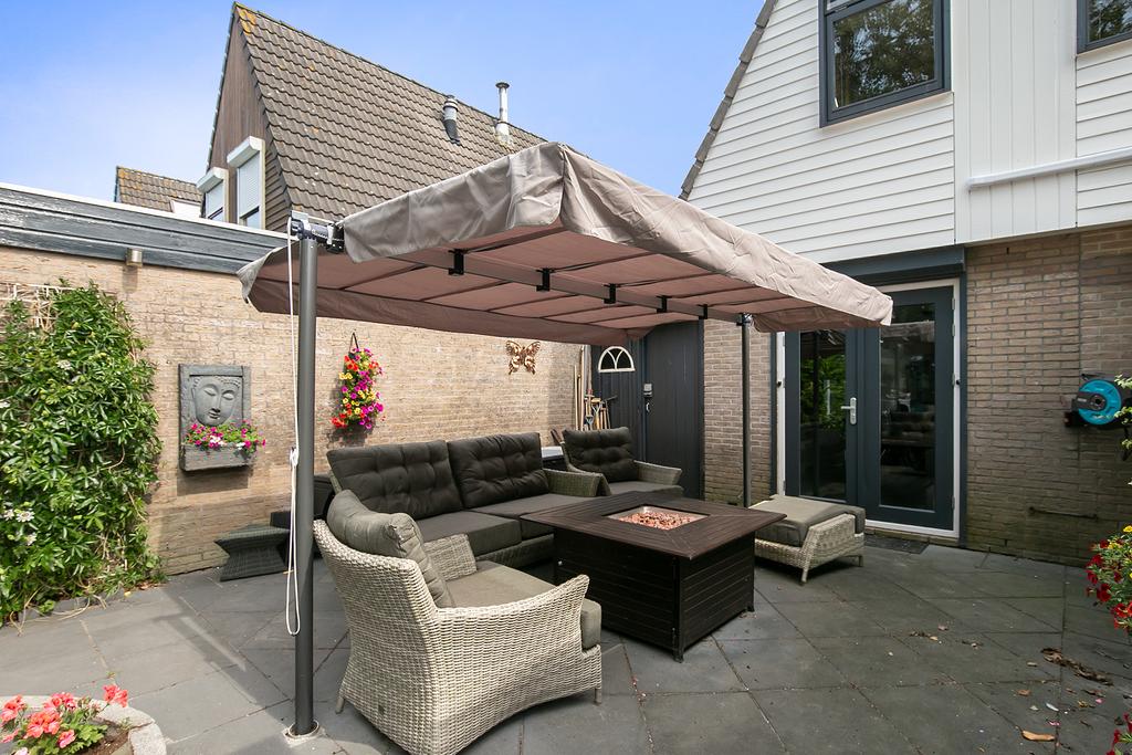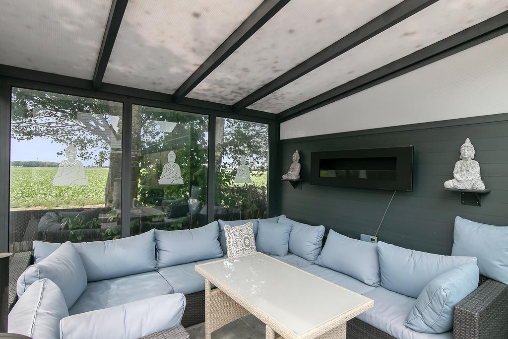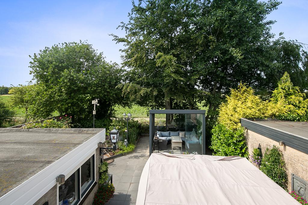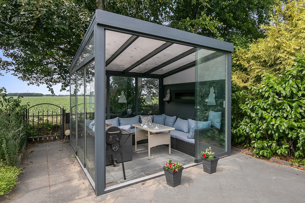 De tuin is de te bereiken via de openslaande tuindeuren, achterom rechts van de woning of via de garage. Deze gezellige tuin biedt veel opties om te loungen. Direct aan het huis is er een overkappingssysteem geplaatst. Dieper in de tuin is er een aluminium tuinkamer met Polycarbonaat dak aanwezig met schuifpuien en bio ethanol heater met 3 standen. Linksachter in de tuin met het trappaadje omhoog bereikt u een klein vijvertje. De tuin heeft een super uitzicht over de strekkende akkers die grenzen aan de tuin. De tuin is voor het grootste betegeld met antracieten tuintegels.