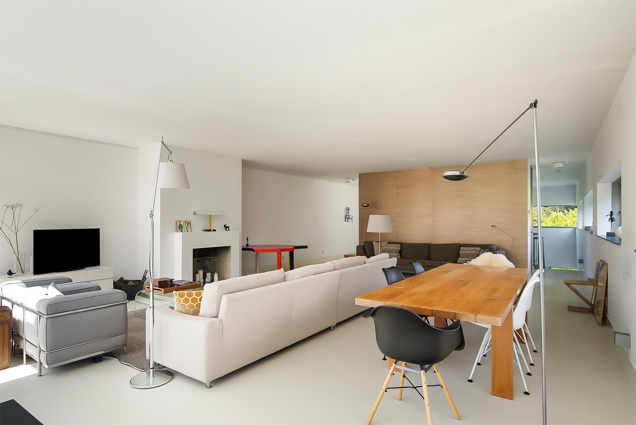 When you walk upstairs, the kitchen is immediately a real eye catcher. The windows on both sides provide a beautiful light on the large kitchen island which is equipped with a beautiful marble stone top. The kitchen is fully equipped such as: 5-burner gas hob, Cooker, mixer tap, dishwasher, design built-in extractor hood, oven, fridge-freezer combination and sufficient space for storing kitchen utensils, this ensures that you can spend countless pleasant evenings with friends. experience. It provides the perfect opportunity to have a drink and cook together! Ideal for a large family. The kitchen has a bar with a view of the greenery. The perfect place for breakfast with a hot cup of coffee! From the hall and past the kitchen you walk into the spacious living room. The big window over the entire back and the high windows on the left side of the room, give a light and open feeling. Here you can enjoy the fireplace in peace, but this room is also suitable for late evenings with good company. Because of the large open layout, there is enough space for a long dining table where you can easily sit with 8 people. At the back of the living room you will find access to the spacious south-facing balcony through the sliding door. This is the perfect place to enjoy the weather and the view on a hot summer day! The unique layout of the house can also be seen here. At the end of the living room you will find a staircase leading down to the master bedroom. Why this is so special? It is located at the rear of the house, has its own balcony and, just like the balcony on the first floor, has a beautiful view over the water. Striking is the large cupboard, which not only functions as a separation between the kitchen from the living room, but is also the staircase to the second floor.