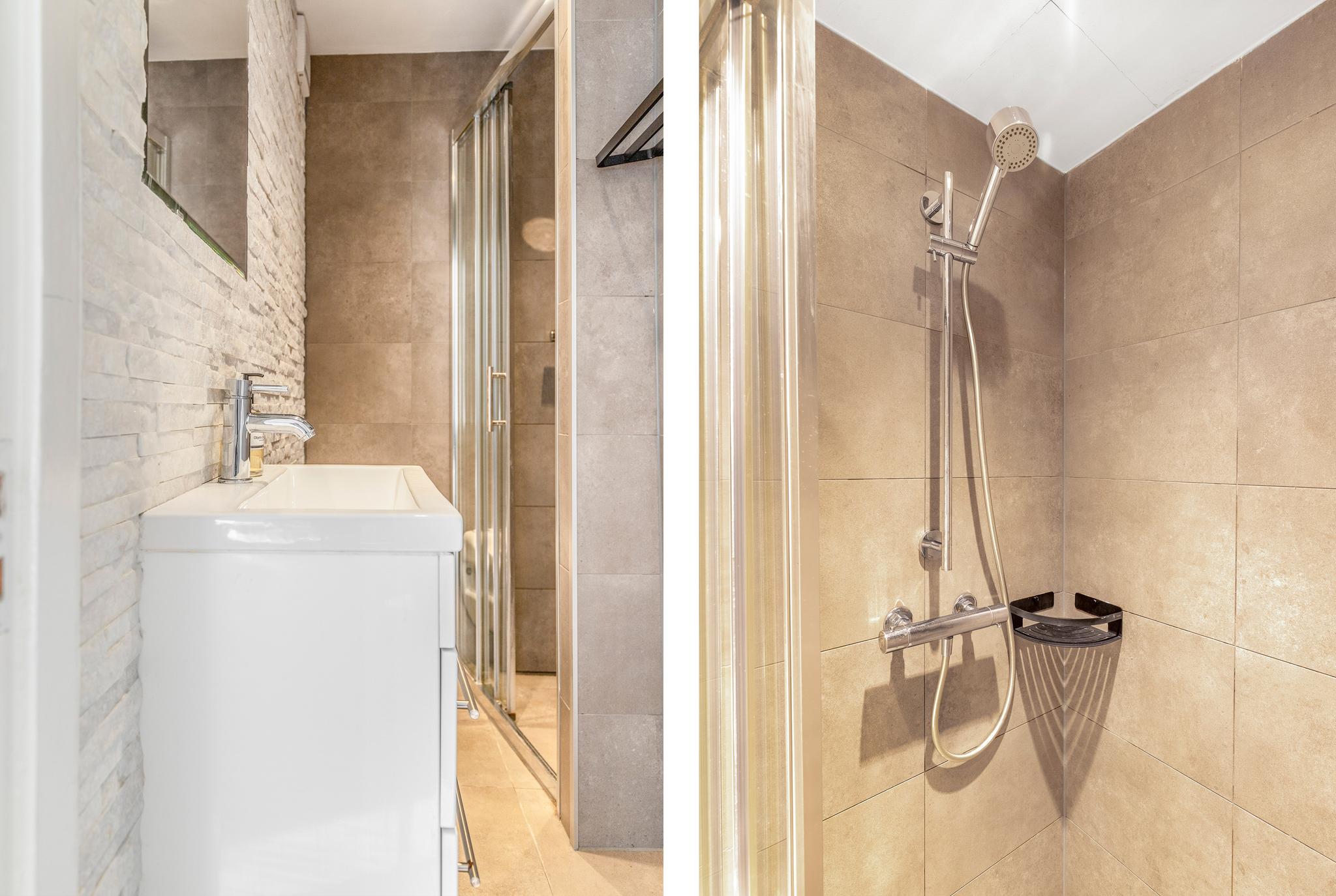The bedroom is adjacent and has enough space for a double bed and a closet. The bathroom has a modern finish. Here you will find a comfortable walk-in rain shower, an elegant washbasin unit with washbasin, and a standing toilet.