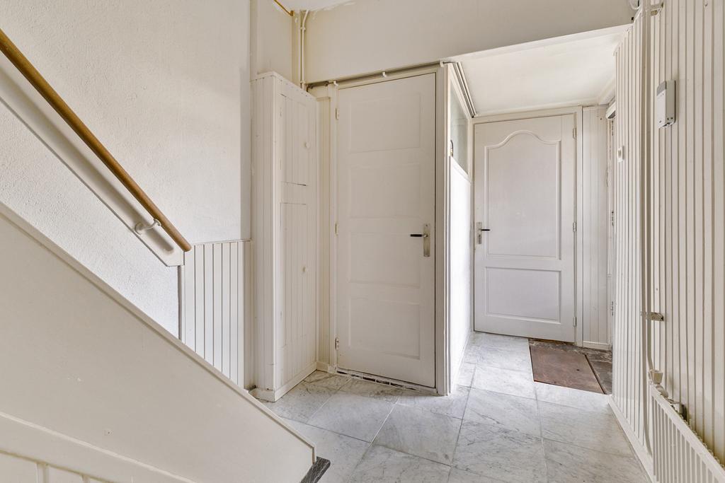 Aan het eind van de ruime en diepe (6,8 m) voortuin kom je bij de voordeur. Aan de voorkant van de woning is een overkapping geplaatst, geschikt voor het stallen van een motor of fietsen. Binnen in de entreehal valt direct de grote marmeren tegelvloer op. Deze tegels geven de ruimte een hele luxe en open uitstraling. Aan de rechterkant bevindt zich een bijkeuken, waar tevens de ingang is naar het vrijstaande toilet. Tegenover de voordeur is de ingang naar de badkamer geplaatst. Dit is een bouwconstructie die kenmerkend is bij jaren ’40 woningen. Deze ruimte kan worden doorgetrokken naar de bijkeuken, waardoor er een grote badkamer wordt gerealiseerd. Aan de linkerkant van de hal is een deur met glazen inzet geplaatst. Deze geeft de hal veel natuurlijk licht, doordat deze in lijn loopt met het grote achterraam. Achter de deur vind je aan de rechterkant de toegang tot de kelder en aan de linkerkant de keuken. De zeer moderne keuken is voorzien van vierpits kookplaat, afzuigkap, koel-vriescombinatie, combimagnetron en een grote landelijke wasbak met mengkraan. Bij binnenkomst in de woonkamer valt gelijk de prachtige houten vloer op. Deze wordt rijkelijk belicht door het grote raampartij en de openslaande deuren. In de hoek van de kamer vind je tevens een vaste kast, ideaal voor het opbergen van de spullen die je liever niet direct in het zicht hebt! Vanuit de openslaande deuren loop je het overdekte terras van de achtertuin in. Hier kun je heerlijk tot laat in de avond borrelen met vrienden en familie.