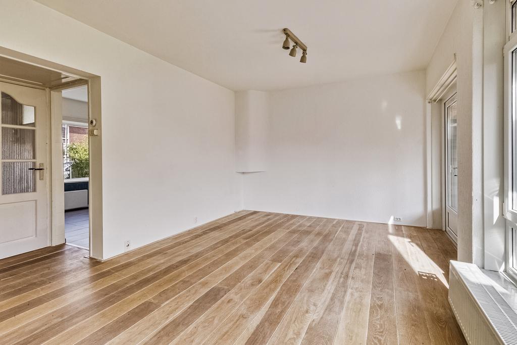 At the end of the spacious and deep (6.8 m) front garden you arrive at the front door. A roof has been placed at the beginning, suitable for storing a motorcycle or bicycles. Inside the hall, the large marble tiled floor is immediately noticeable. These tiles give the room a very luxurious and open appearance. On the right is a utility room, which also has the entrance to the detached toilet. The entrance to the bathroom is located opposite the front door. This is a building construction that is typical of 1940s homes. These areas can be extended to the utility room, creating a large bathroom. A door with a glass insert has been placed on the left side of the hall. This gives the hall a lot of natural light, because it runs in line with the large rear window. Behind the door you will find access to the basement on the right and the kitchen on the left. The very modern kitchen is equipped with a four-burner hob, extractor hood, fridge-freezer combination, combination microwave and a large country sink with mixer tap. Upon entering the living room, you immediately notice the beautiful wooden floor. This is richly illuminated by the large windows and the French doors. In the corner of the room you will also find a closet, ideal for storing things that you would rather not have in direct view! From the French doors you walk into the covered terrace of the backyard. Here you can enjoy drinks with friends and family until late in the evening.