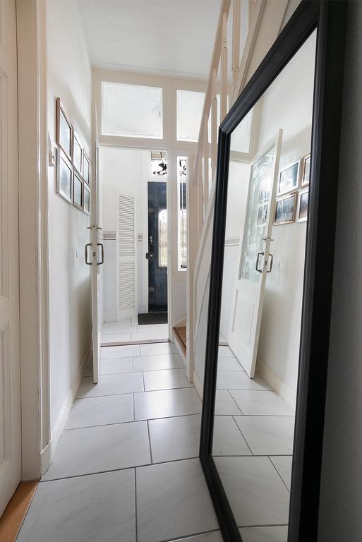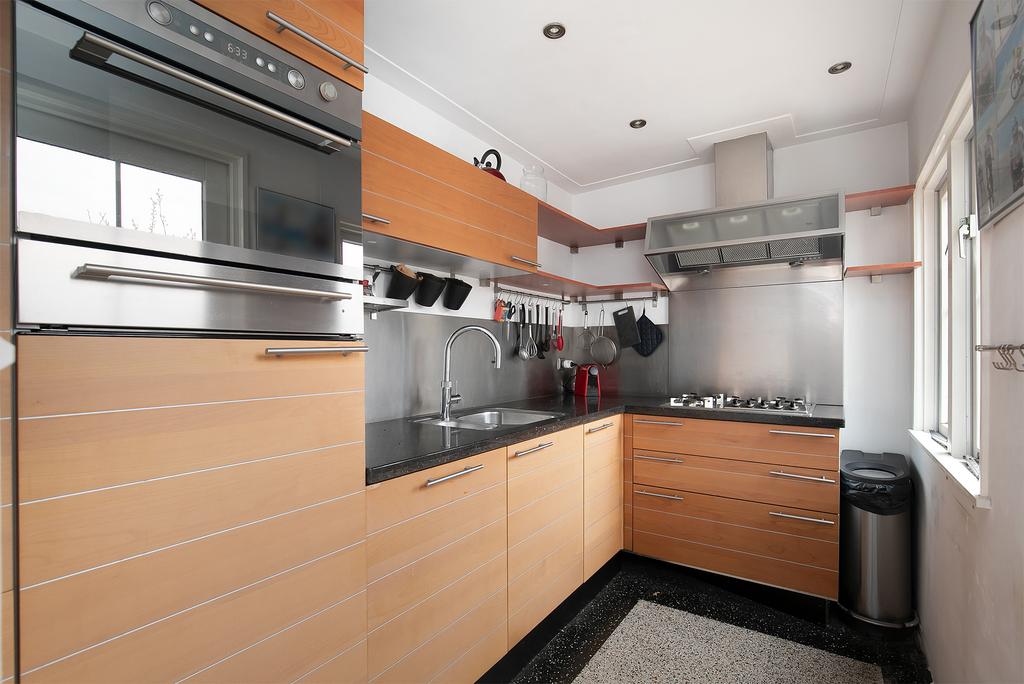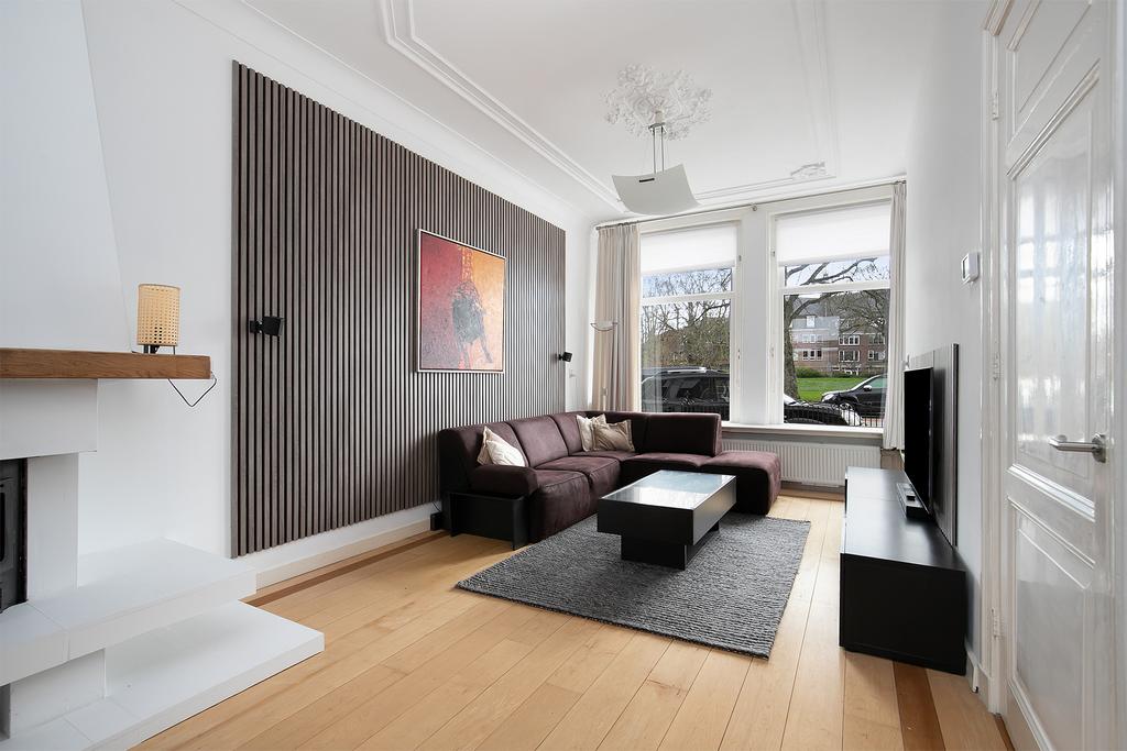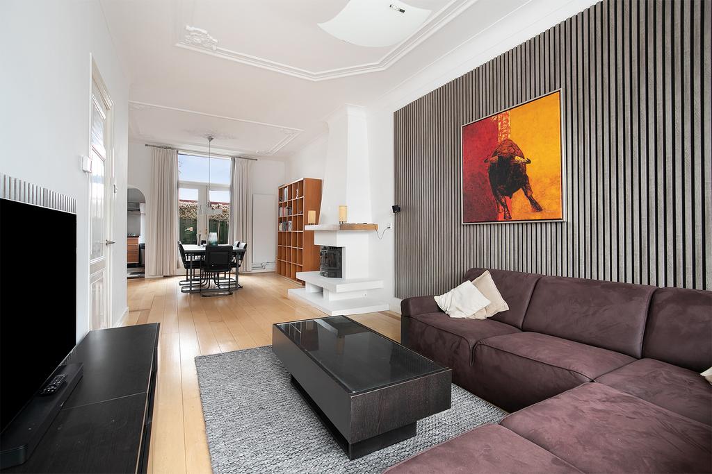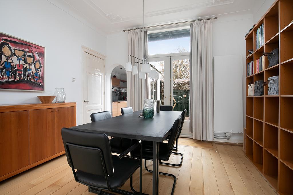 Through the spacious front porch with a beautiful facade and original tiling, you enter the house through the vestibule, meter cupboard. The hall, which has a nice light finish, provides access to a separate toilet, stair cupboard with access to the basement and staircase. Living room: What a space and light! The living room has a live and dinner area. The high ceiling (3.05 m) and walls are completely plastered, but retaining the characteristic ornaments and detailing. The fireplace with fireplace, oak ‘Maple’ wooden floor and wooden wall cladding creates a warm rural feeling that makes you feel right at home. Through the dining area you enter the semi-open kitchen with a view of the garden. The kitchen is equipped with a refrigerator, oven, microwave, 5-burner gas hob, extractor hood, dishwasher and terrazo floor, the kitchen door leads to the garden and the attached wooden shed. The house has been improved on several points. The entire house has double glazing, the exterior painting was done two years ago and new awnings (blinds) have been installed.