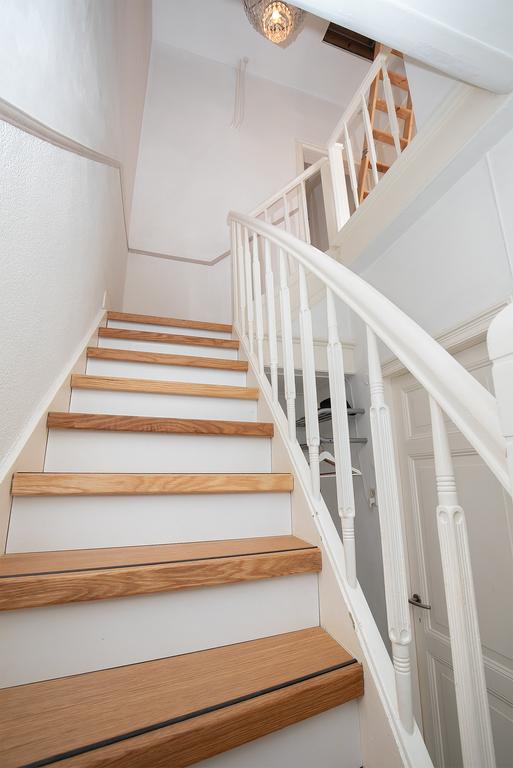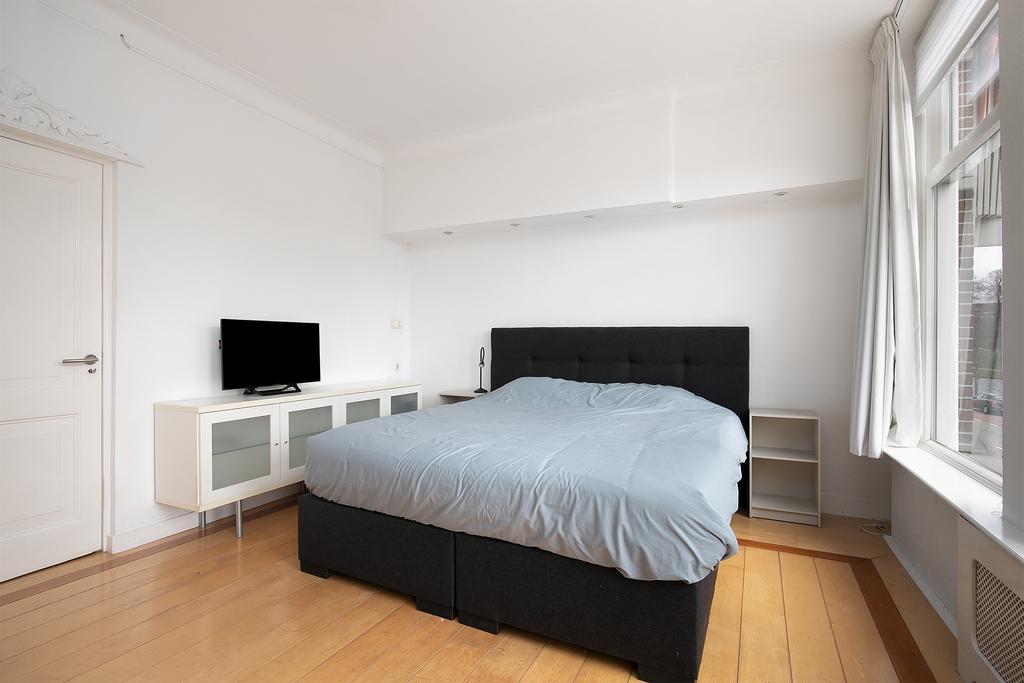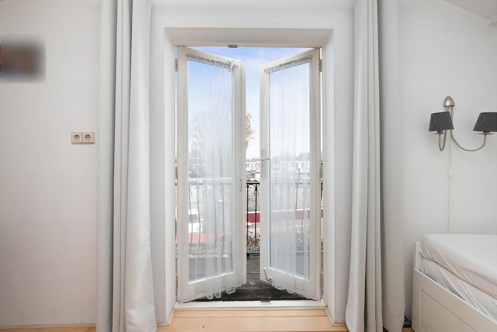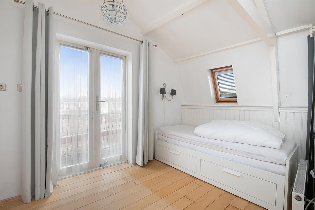 Via the stairs you reach the landing. The rural warm tones also continue on the first floor. Immediately on the left is the first bedroom with balcony, the original wooden beams give this bedroom its typical character. From the balcony, which is accessible from the bedroom, you have a view of the garden of the house. The second door gives access to the spacious bathroom, with two sinks, toilet and large bath (jacuzzi) and shower. This bathroom has everything you need, the bathroom is also equipped with underfloor heating and a skylight. The second spacious bedroom adjacent to the front of the house with cupboard wall, has an extraordinary amount of natural light. The three large original window frames not only have a lot of natural light, but also a beautiful view over the water and the green city center.