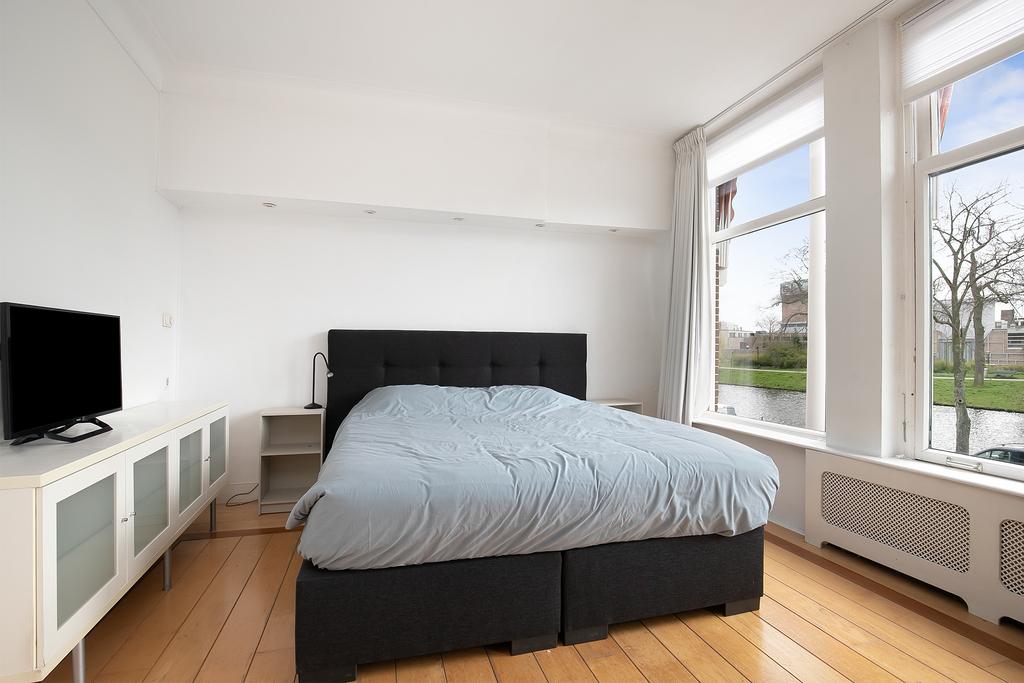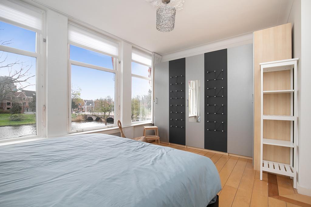 Via de trap komt u uit op de overloop. De landelijk warme tinten zetten zich ook voort op de eerste verdieping. Direct links komt in de eerste slaapkamer met balkon, de originele houtenbalken geven deze slaapkamer zijn typische karakter. Vanuit het balkon, welke bereikbaar is vanuit de slaapkamer, heeft u uitkijk op de tuin van de woning. De tweede deur geeft toegang tot de riante badkamer, met twee wasbakken, toilet en groot ligbad (jacuzzi) en douche. Deze badkamer heeft alles wat u nodig heeft, tevens is de badkamer voorzien van vloerverwarming en een dakraam. De tweede ruime slaapkamer die grenst aan de voorzijde van de woning met kastenwand, heeft buitengewoon veel natuurlijk lichtinval. De drie grote originele raamkozijnen hebben niet alleen veel natuurlijk lichtinval, maar ook een prachtig uitzicht over het (vaar)water en het groene stadscentrum.