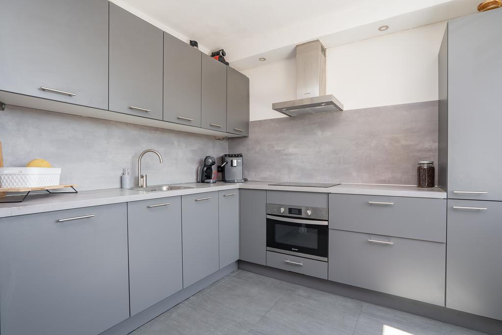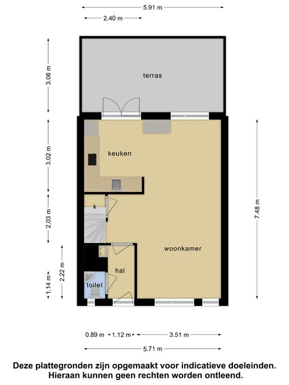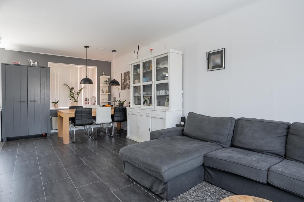 Bij binnenkomst in de woning betreed je de hal, die toegang geeft tot de verschillende ruimtes op de begane grond. Hier bevindt zich ook een separaat toilet met wasbak. De ruime woonkamer is heeft veel natuurlijk zonlicht en heeft voldoende ruimte voor een comfortabele zit- en eethoek. De muren zijn met wit en lichtgrijze tinten geverfd. De begane grond heeft een donkergrijze tegelvloer. Aangrenzend aan de woonkamer is een open keuken, die voorzien is van vaatwasser, oven, koelkast met vriesvak. De keuken heeft voldoende strak grijze opbergruimte met een composiet keukenblad. Vanuit de woonkamer en keuken is er toegang tot het terras. Het ruime terras is gericht op het zuiden en voorzien met luifel.