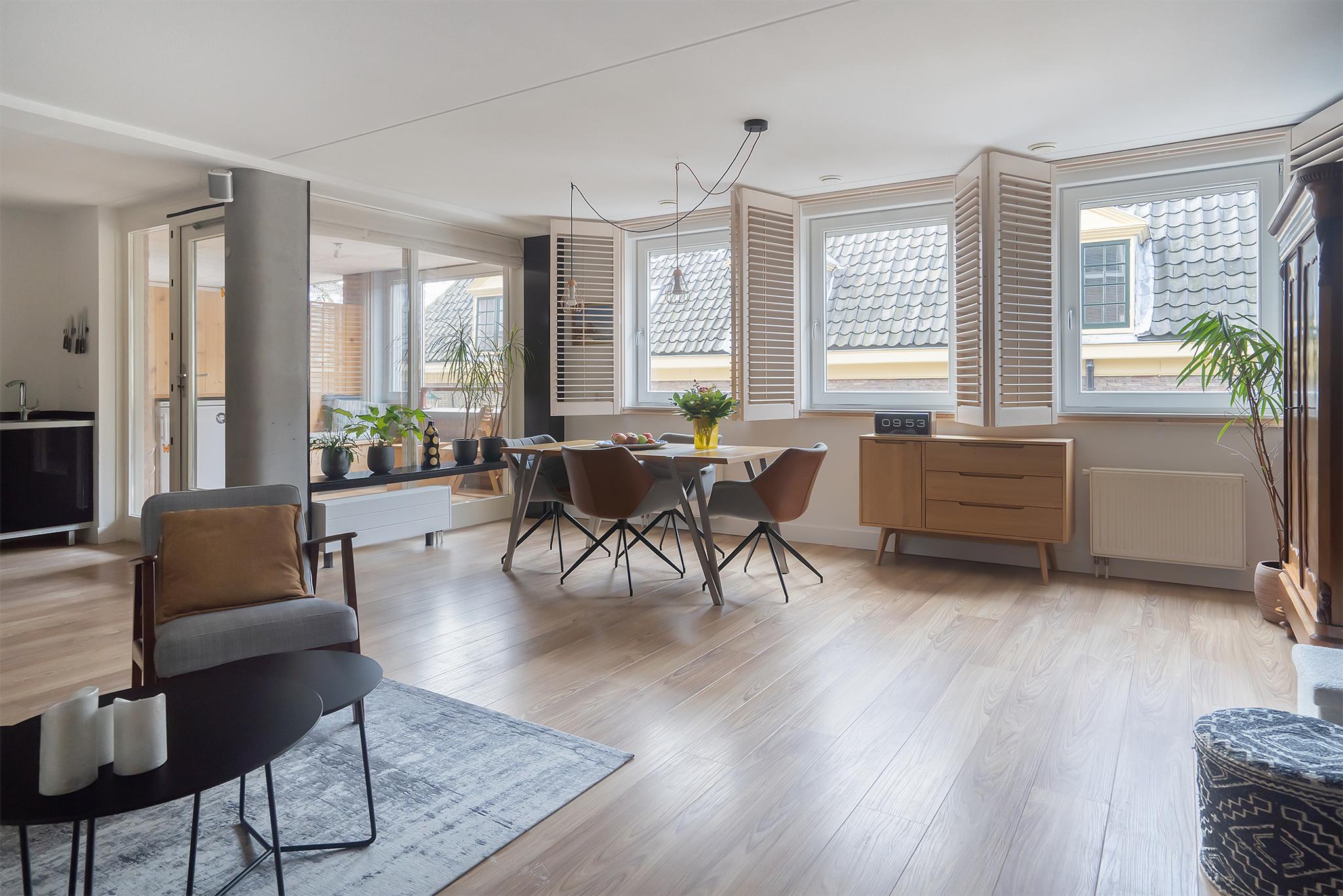 There is an intercom system and mailboxes on the outside of the building. Upon entering you have the choice of taking the elevator or the stairs to the first floor. You walk through the courtyard at the back left to the front door of the apartment. The long hall of over 6 meters immediately gives this apartment a spacious appearance. The bedrooms are located on either side. The windows placed in the ceiling make these rooms unique and give the room unique light. The spacious bedroom on the right side of the apartment, measuring 16m2, is an oasis of space where you can relax on your king-size bed. The bedroom also offers access to a walk-in closet! Enough space for all your clothes. At the end of the hall you will find the separate toilet on the left and the bathroom on the right. This has both a shower and a bath, where you can relax after a long working day. At the end of the hall you enter the living room with open kitchen. The windows with decorative shutters on the inside give the room an eccentric appearance. The open layout with an area of 32 m2 offers the opportunity to give substance to your ideal layout of the space. The kitchen has a kitchen island with bar, oven, microwave, extractor hood, five-burner hob with wok burner and double sink with mixer tap. On the left side of the kitchen is the door to the utility room. Here is plenty of room for your supplies, an American refrigerator, recently renovated central heating boiler and the connection for a washing machine and dryer. On the right side of the kitchen is the outside door that leads to the balcony. With the extra refrigerator within reach, you can enjoy refreshing drinks with friends and family on summer days! Is the sun a little too bright? Then you can use the electric sun blinds that have been installed. Do you like a Burgundian life and would you like to see yourself living in the heart of Alkmaar? Please contact us quickly to schedule a viewing appointment!