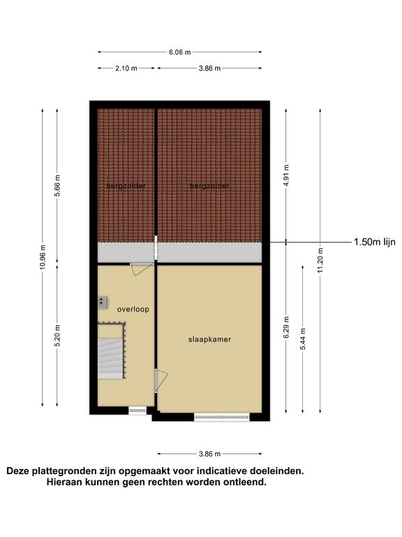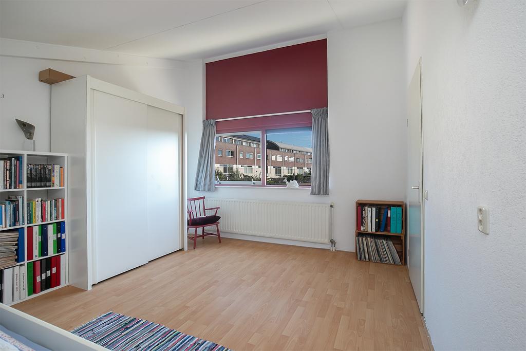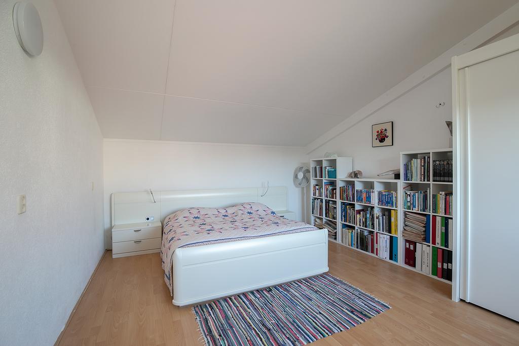Vanuit de hal bevindt zich de trap die leidt naar de eerste verdieping. Op de overloop is de CV-ketel en de toegang tot de zeer grote bergzolder te vinden. Hier is de tweede grote slaapkamer gelegen. Ideaal als u gasten heeft die blijven overnachten. Door het grote raam, met uitzicht op het plantsoen, heeft deze kamer ook een mooie natuurlijke lichtinval.