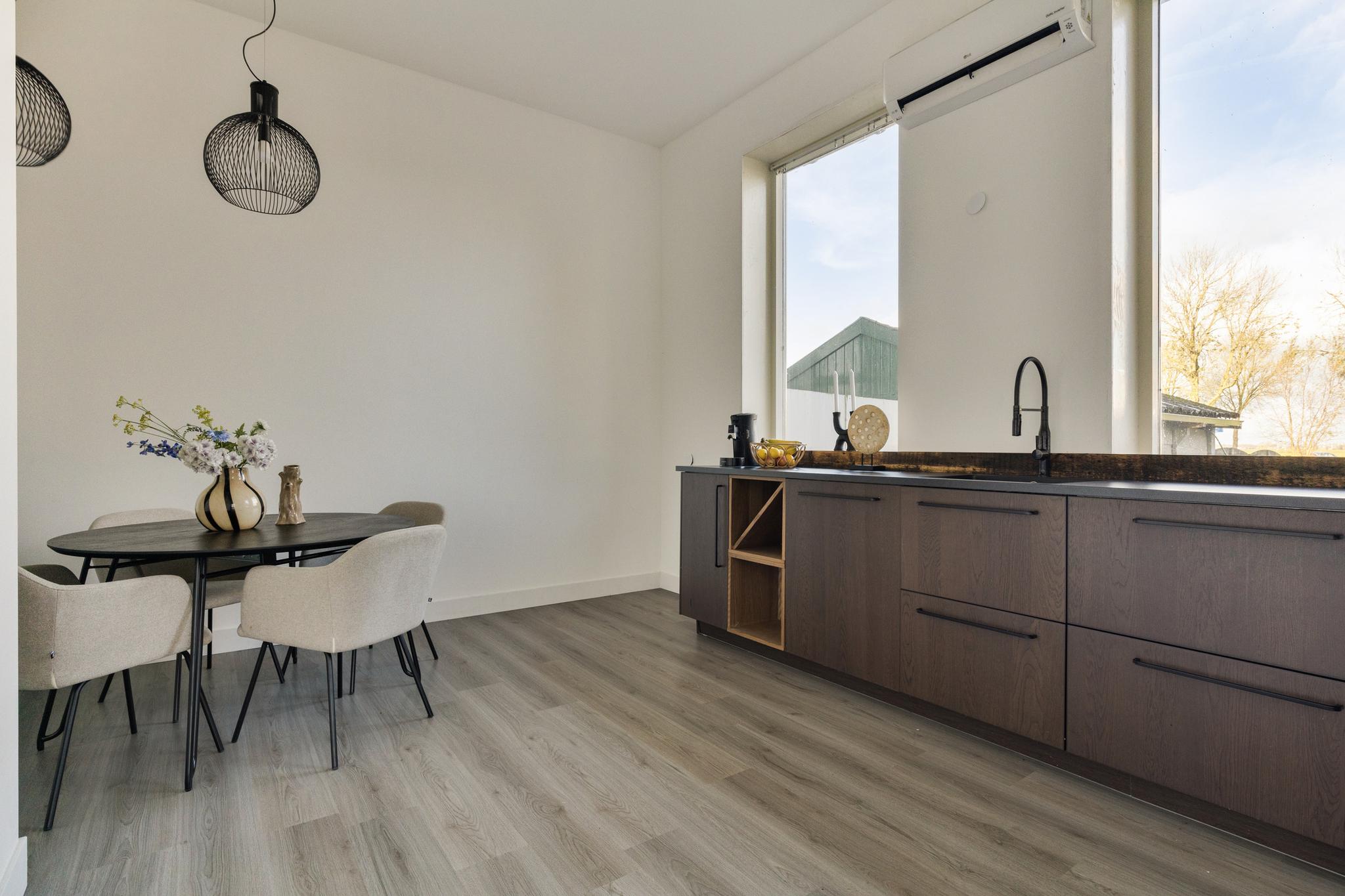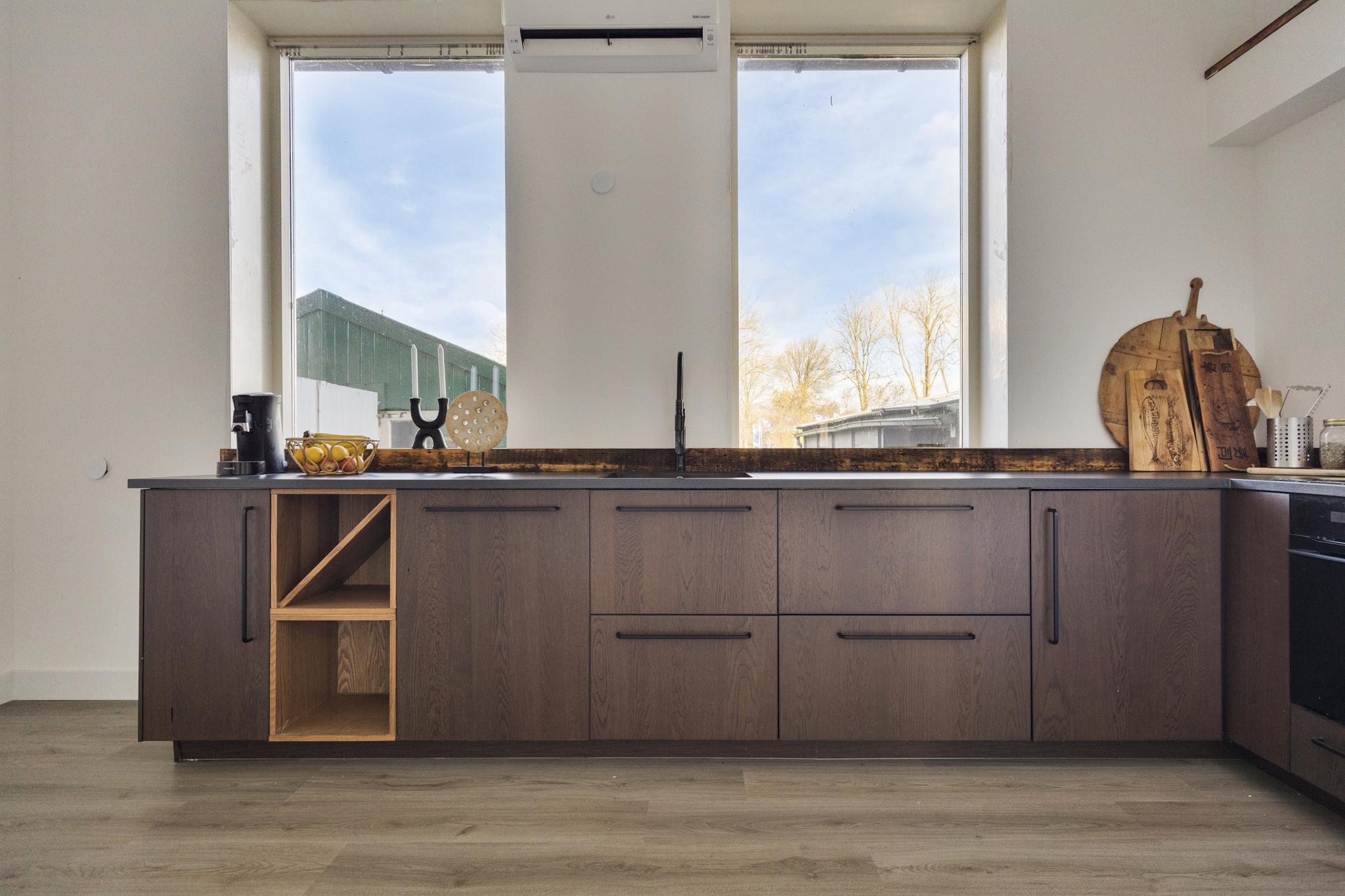 The entrance door to the house is located on the side of the building. Upon entering, you are immediately greeted by the luxurious appearance of the high ceiling and the natural wooden stairs. The entire house was plastered this year and a new floor was laid on the ground floor. From the front door you walk straight through the bar into the large kitchen. The large windows overlooking the backyard give this kitchen plenty of natural light. The stylish dark wood kitchen has a modern extractor hood, sink with pull-out sink tap, oven, built-in dishwasher and air conditioning. The large surface area provides plenty of storage space. The detached toilet is located next to the kitchen. This room is also very modern and even has a urinal next to the toilet. The living room is located at the front of the parsonage. This has ceiling-high windows with natural stone window sills and air conditioning has also been installed here.