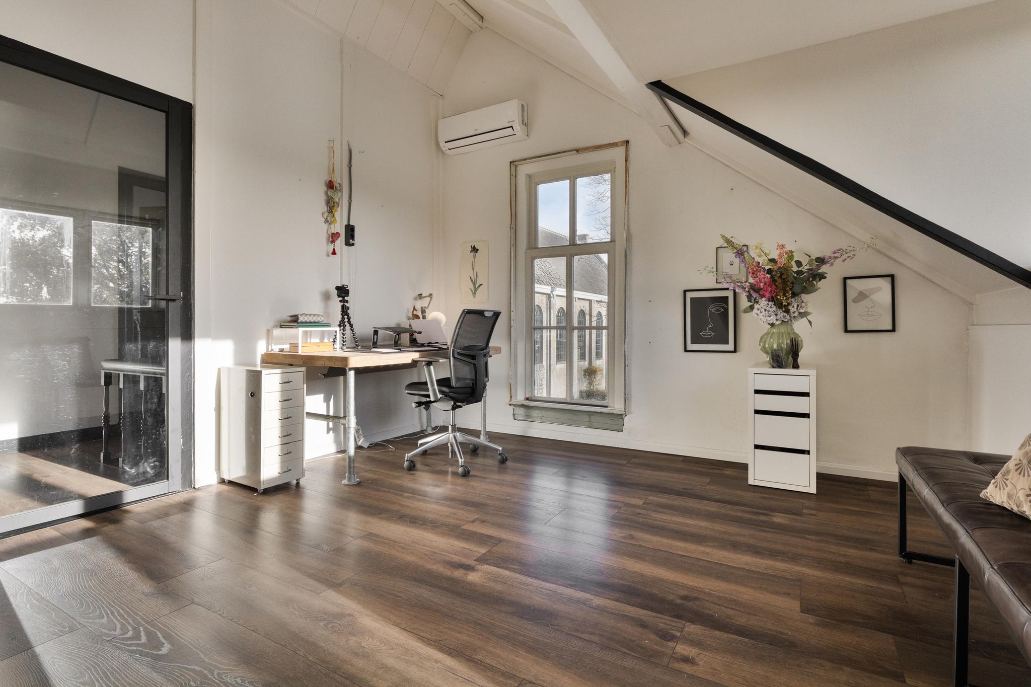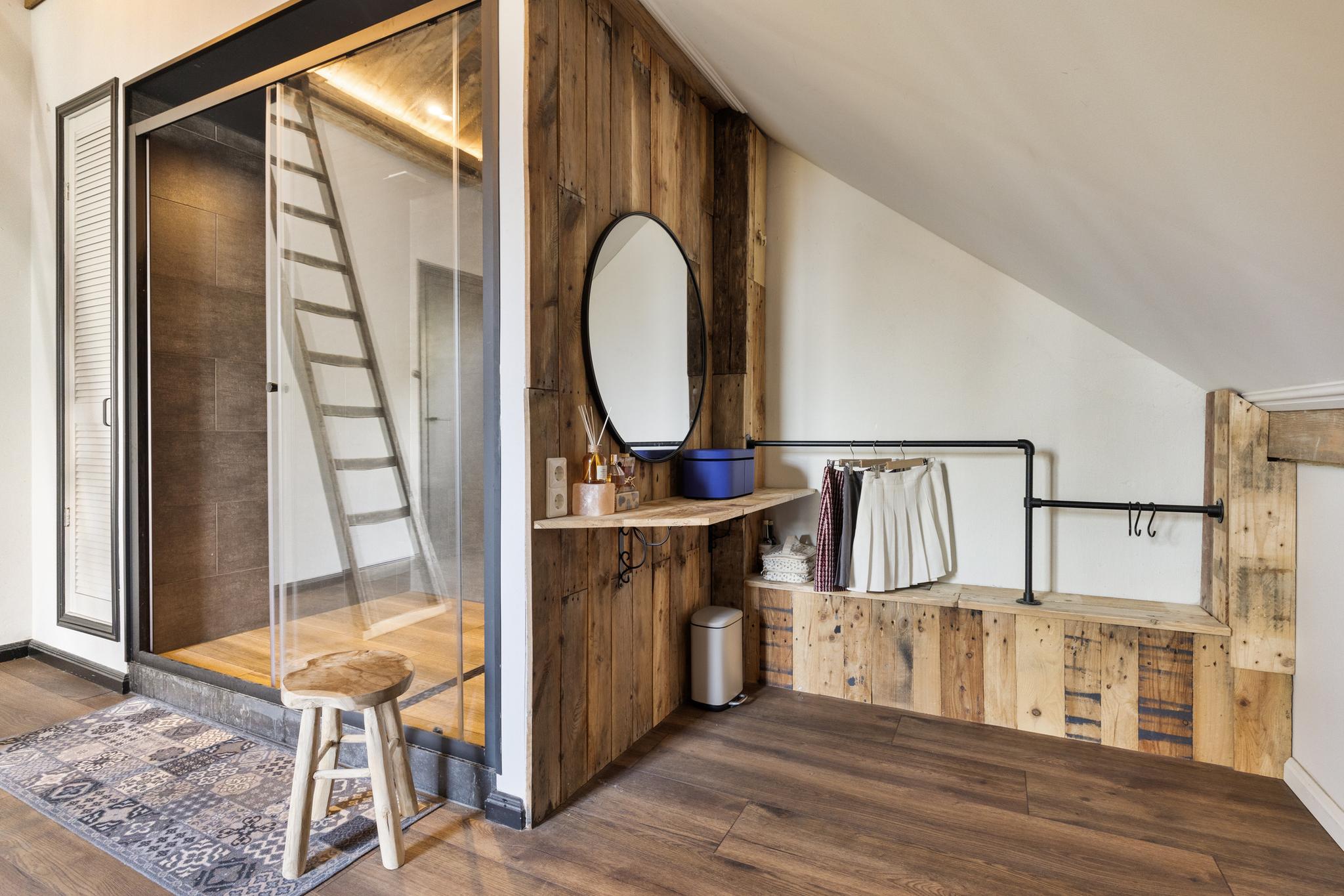 De trap naar de eerste etage staat in het midden van de pastorie. De houten treden en de sierlijke spijlen van de leuning maken het tot een echte eyecatcher. Op de overloop is de aansluiting voor een wasmachine en droger. Hiernaast is de toegangsdeur naar de slaapkamer aan de voorzijde van de woning. Deze slaapkamer heeft een dakkapel, is zeer royaal en bied ruimte voor een kingsize bed. Natuurlijk kun je deze ruimte ook gebruiken als kantoor/werkkamer. De kers op de taart van deze pastorie is echter de slaapkamer die is gelegen aan de achterzijde. Deze ensuite slaapkamer heeft een moderne ingebouwde douchecabine. De karakteristieke elementen van de historierijke pastorie worden hierdoor op sublieme wijze gecombineerd met een eigentijdse stijl. Hier start je de dag fris op en kom je aan het eind van de dag weer volledig tot rust.