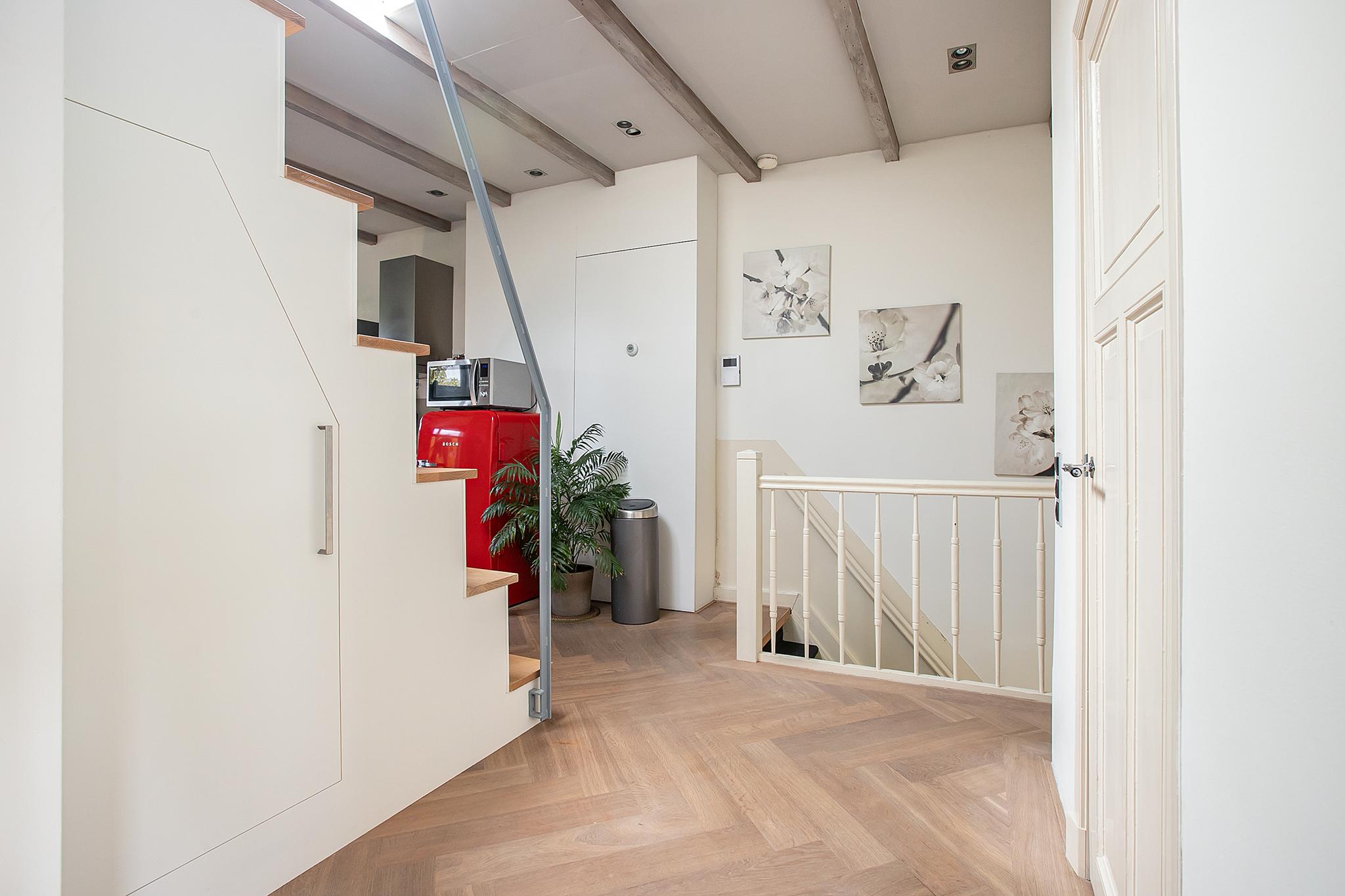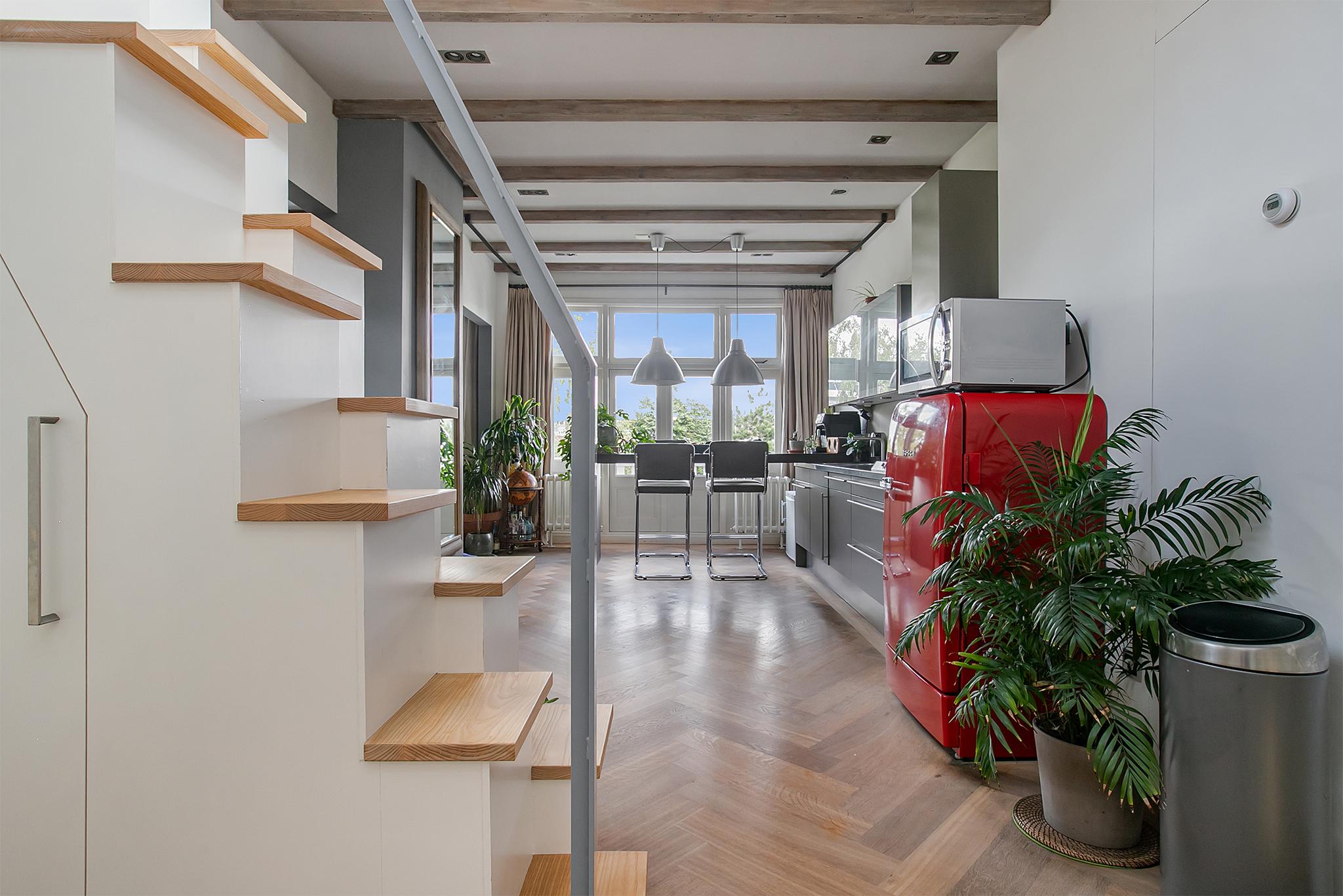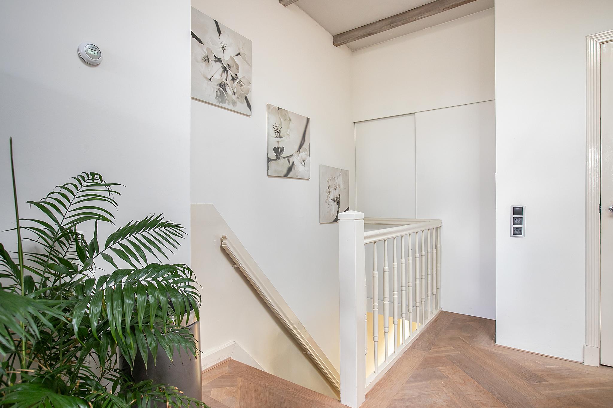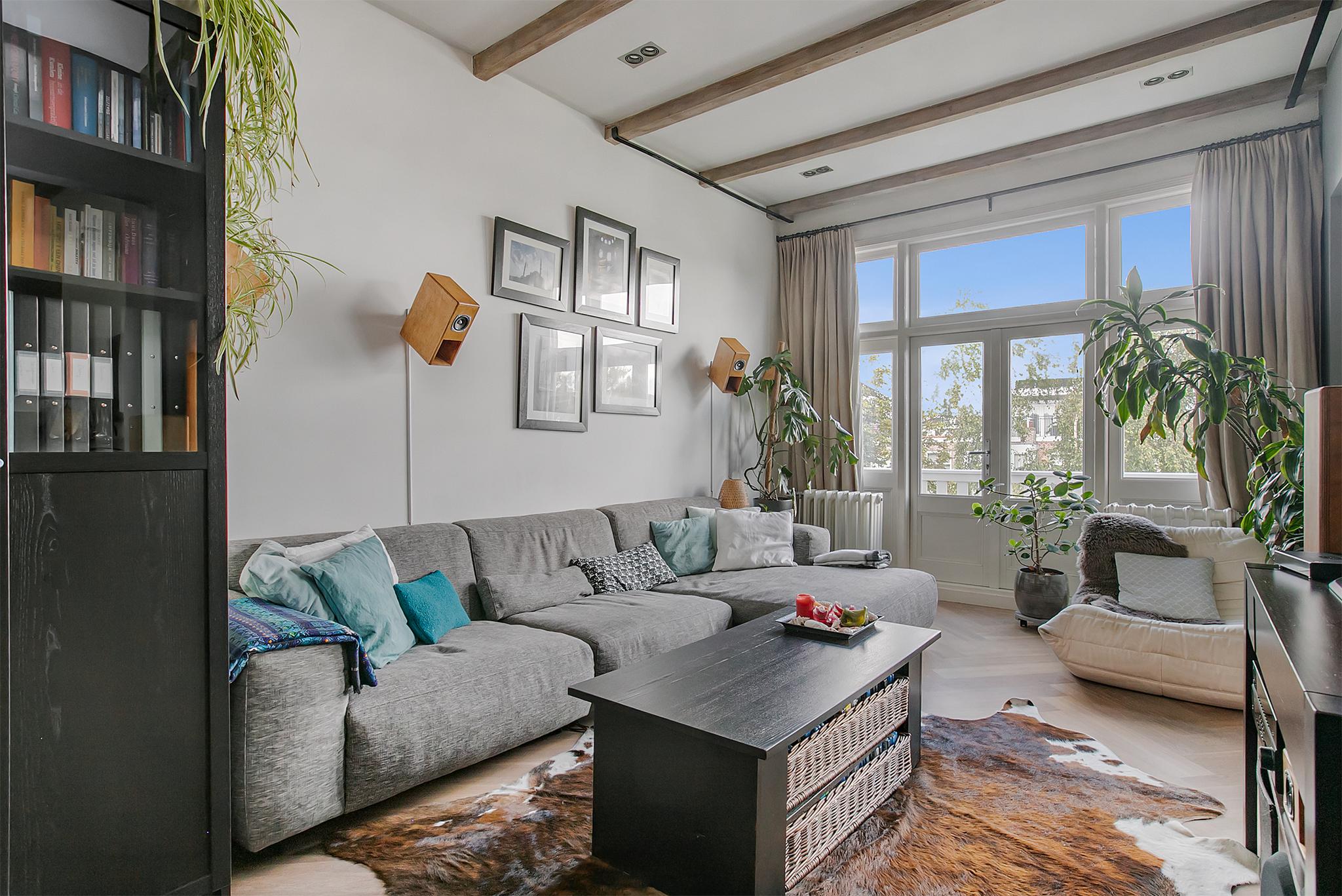 Via the entrance, coat rack, meter cupboard and central heating system, you walk up the stairs and step straight into this spacious and characteristic apartment. The historic details, such as the wooden herringbone floor, the high ceiling with recessed spotlights and the graceful doors, make you immediately feel at home. At the rear of the stairs is a cupboard with the boiler. Here is also a connection for a washing machine and extra storage space. From the landing you enter the modern kitchen. This has natural light through the large windows at the rear of the house. The kitchen has a metal-finished countertop, upper cabinets with built-in spotlighting, four-burner hob, designer extractor hood, dishwasher, separate Bosh refrigerator and a cozy bar. Here you can work efficiently and enjoy pleasant late evenings! To the left of the kitchen are two open passages to the lovely living room. There is room for a large corner sofa, lounge chairs and even a separate dining area. The French doors give the living room beautiful light. They also provide access to the 7 m2 balcony that covers the entire rear of the apartment.
