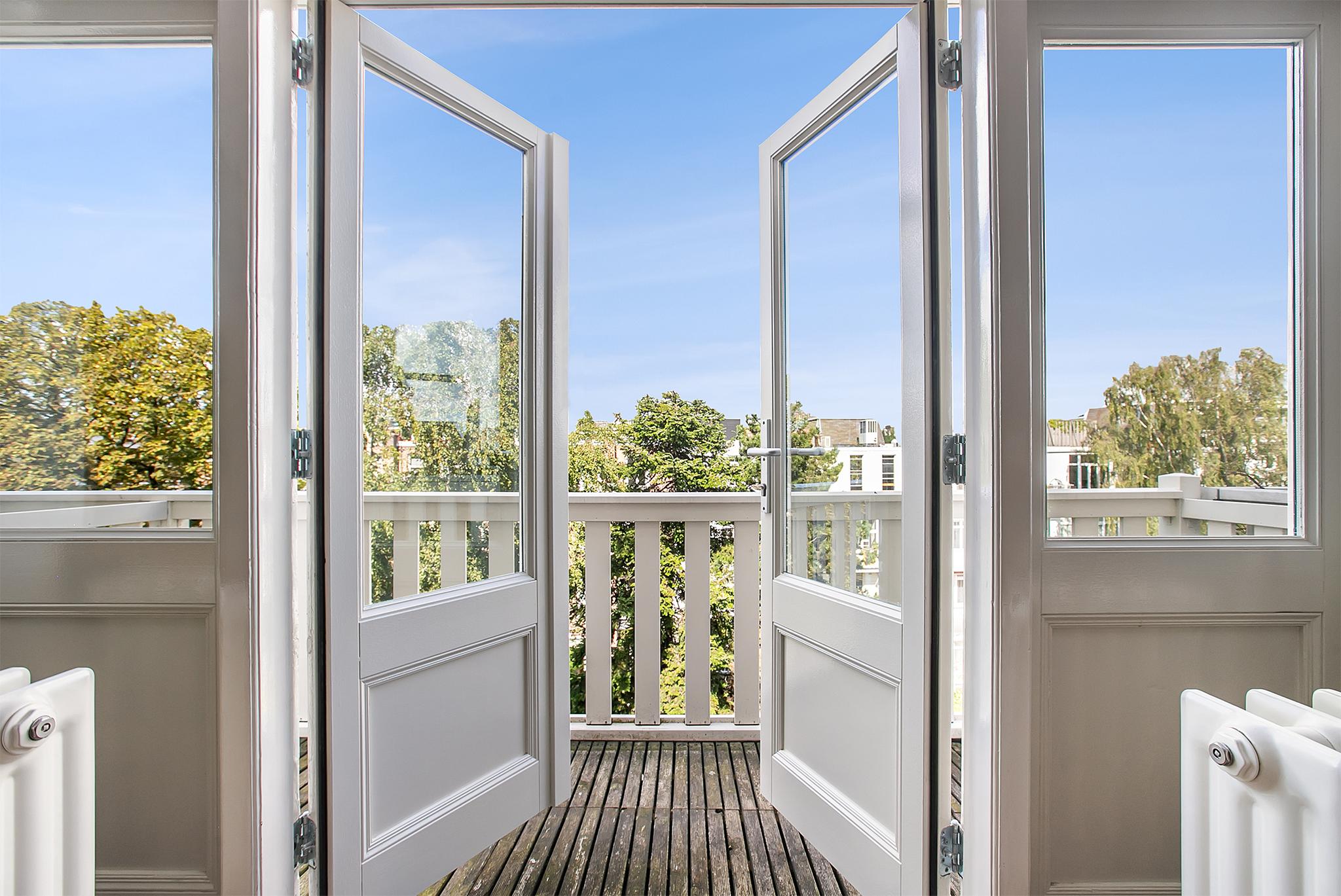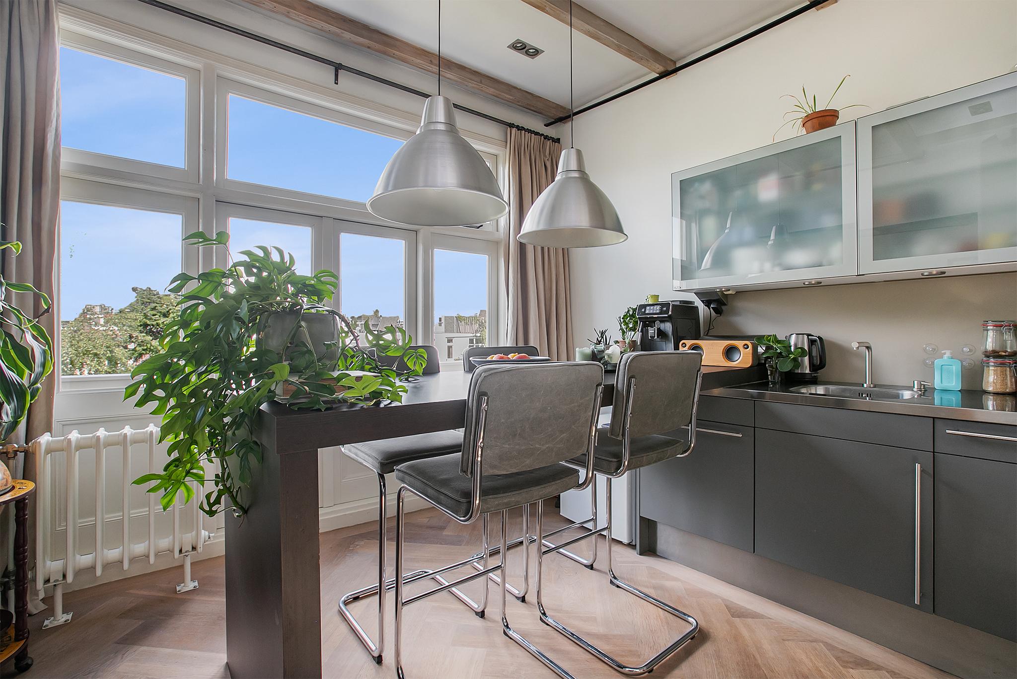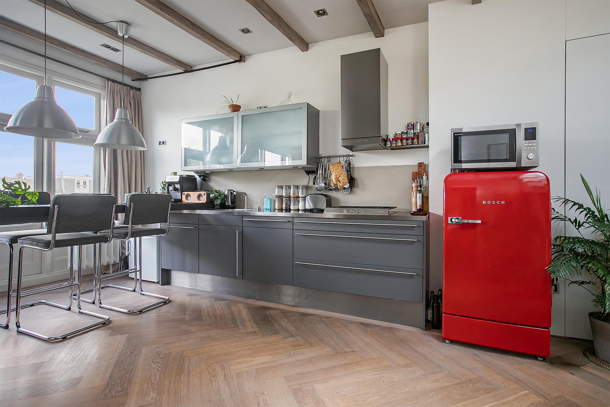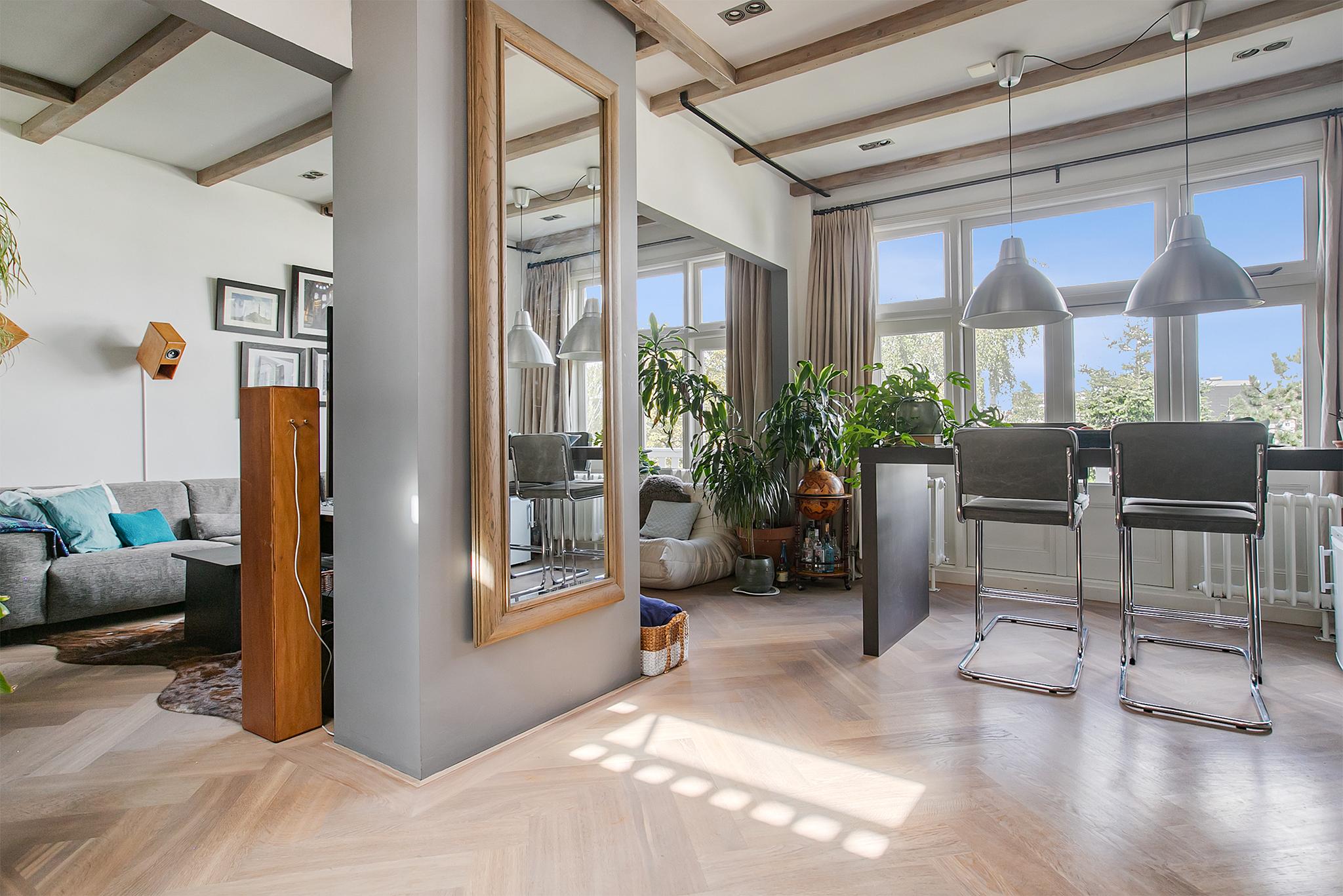 Via the entrance, coat rack, meter cupboard and central heating system, you walk up the stairs and step straight into this spacious and characteristic apartment. The historic details, such as the wooden herringbone floor, the high ceiling with recessed spotlights and the graceful doors, make you immediately feel at home. At the rear of the stairs is a cupboard with the boiler. Here is also a connection for a washing machine and extra storage space. From the landing you enter the modern kitchen. This has natural light through the large windows at the rear of the house. The kitchen has a metal-finished countertop, upper cabinets with built-in spotlighting, four-burner hob, designer extractor hood, dishwasher, separate Bosh refrigerator and a cozy bar. Here you can work efficiently and enjoy pleasant late evenings! To the left of the kitchen are two open passages to the lovely living room. There is room for a large corner sofa, lounge chairs and even a separate dining area. The French doors give the living room beautiful light. They also provide access to the 7 m2 balcony that covers the entire rear of the apartment.