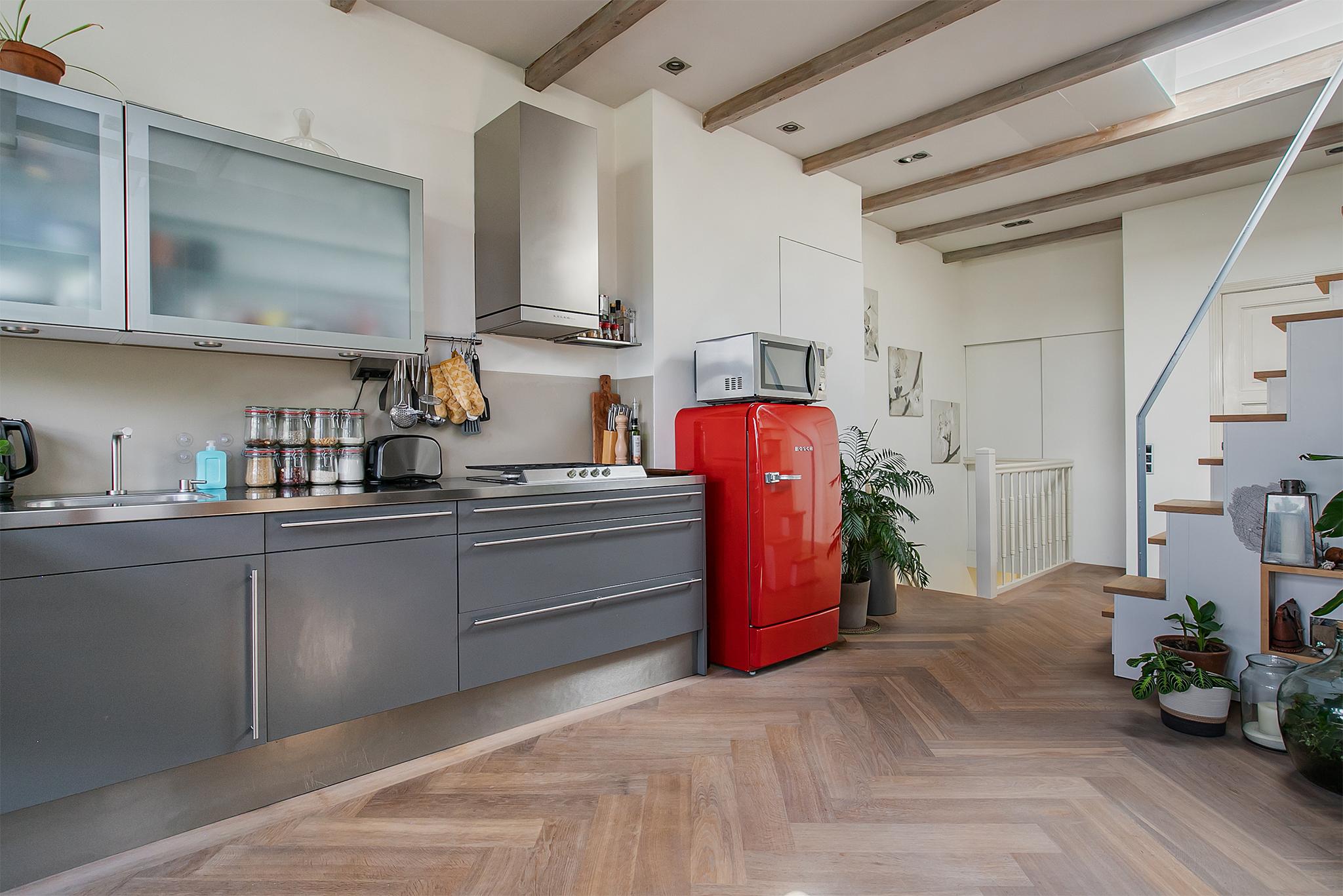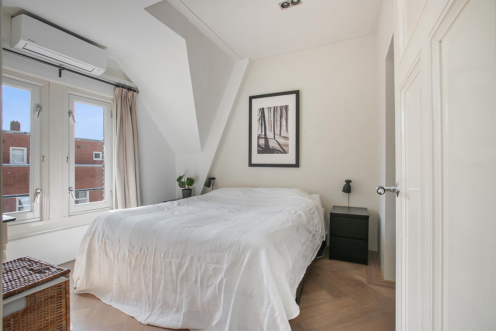 This attractive apartment is located in Oud-Zuid. Joop Braakhekke’s restaurant La Garage is located in this street as well. Do you like to go to a good café in the evening? Then you can go to the well-known café Wildschut. The Albert Cuyp and P.C. Hooftstraat are also just a stone’s throw away. You can also easily take the tram; the stop is located on the corner of the street. The sunny 2-room apartment has a spacious living room and open kitchen, and a stylish wooden herringbone floor. The balcony (7 m2) and the large roof terrace (29 m2) which have a view over the Museumplein and the Zuidas are special. Wonderful living starts here.