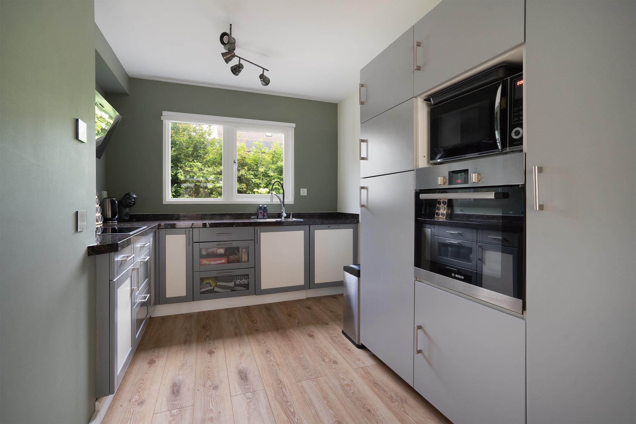 You enter the hall through the front door that is placed on the side of the house. On the right side is an additional access door to the office. The detached toilet can be found on the other side. This has been finished with white and gray tiles. At the back of the hall you will find the stairs, the meter cupboard and access to the living room. The room is naturally illuminated by the large windows with French doors. This gives you a full view of the spacious backyard. The living room has just been finished with a wood-look floor and modern spot lighting incorporated into the ceiling. The spacious layout provides sufficient space for placing a large corner sofa, dining area, storage cupboards and/or side tables. The long wall on the left provides enough space to place a large TV. At the front of the room you will find the kitchen. This is equipped with a microwave, built-in oven, dishwasher, refrigerator, luxury extractor hood, induction hob, double sink, mixer tap with pull-out spray head and ceiling-high cabinets.