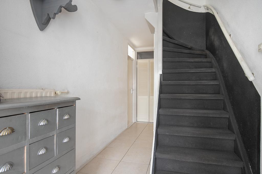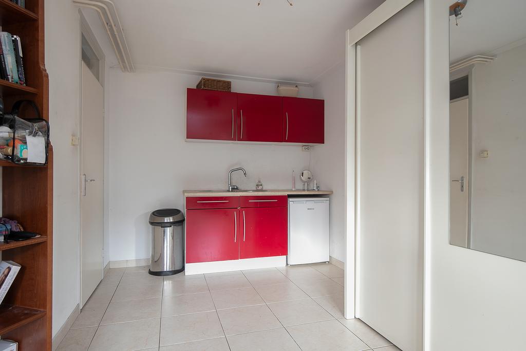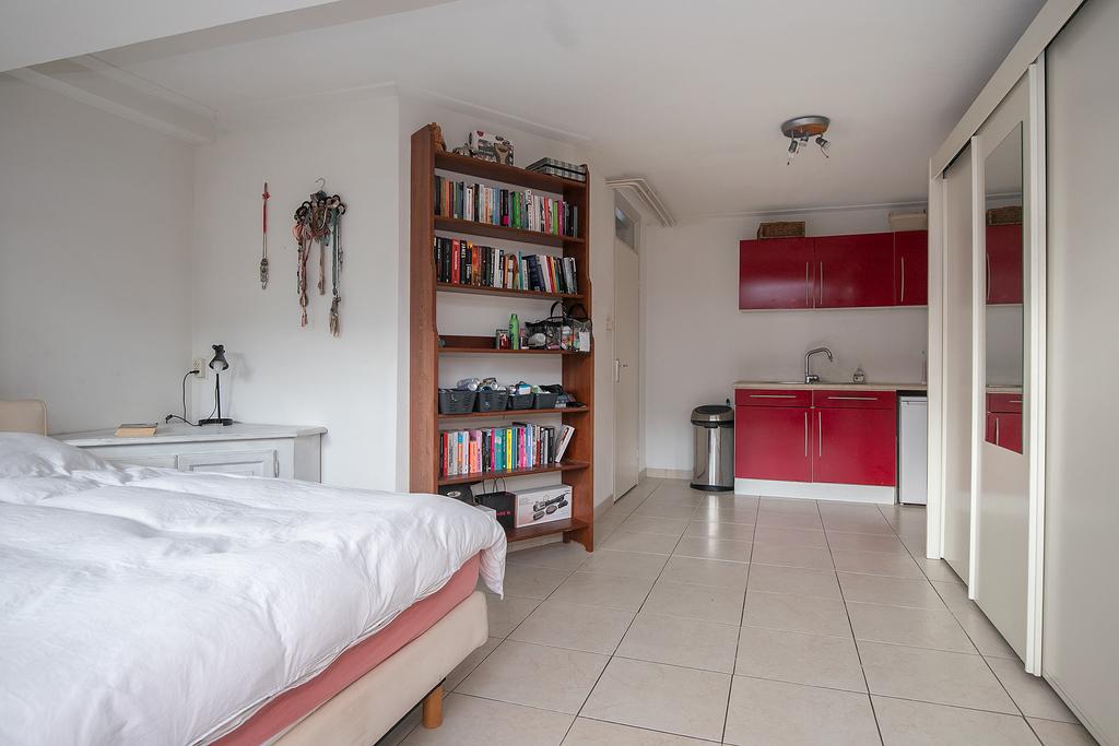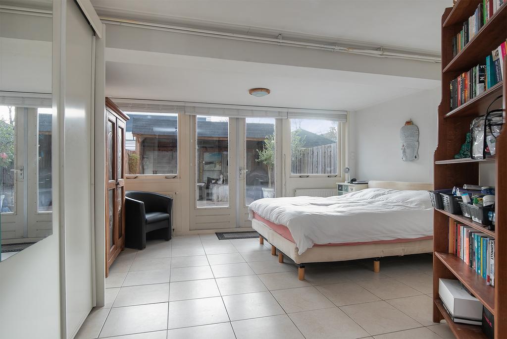 Because you live here in a drive-in house, this house has a unique layout. Through the spacious front garden you enter the first hall, which also has a direct entrance to the garage.One door further you enter the second hall with the stairs that lead to the first floor. At the end of the hall you will find a separate toilet and a laundry room. To the left of the hall is access to the first large bedroom. What is special about this room is that a small kitchen unit has been placed here. The large French doors at the rear of the room provide access to the spacious backyard. The cold drinks are close by in the summer!?