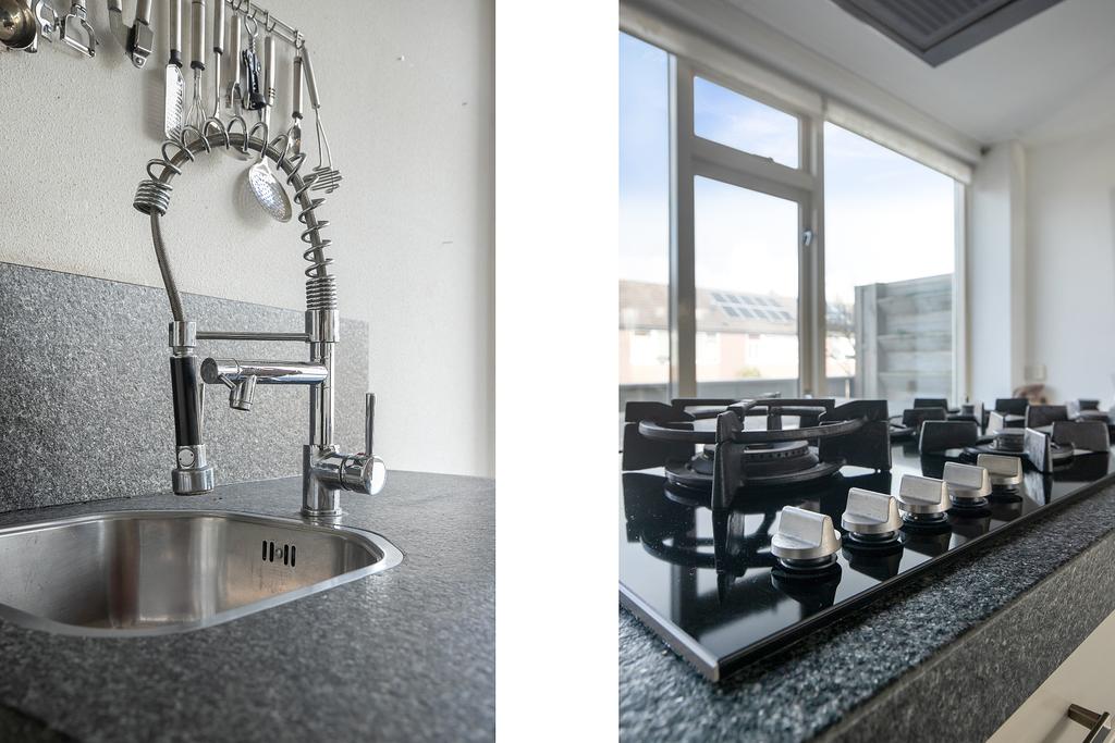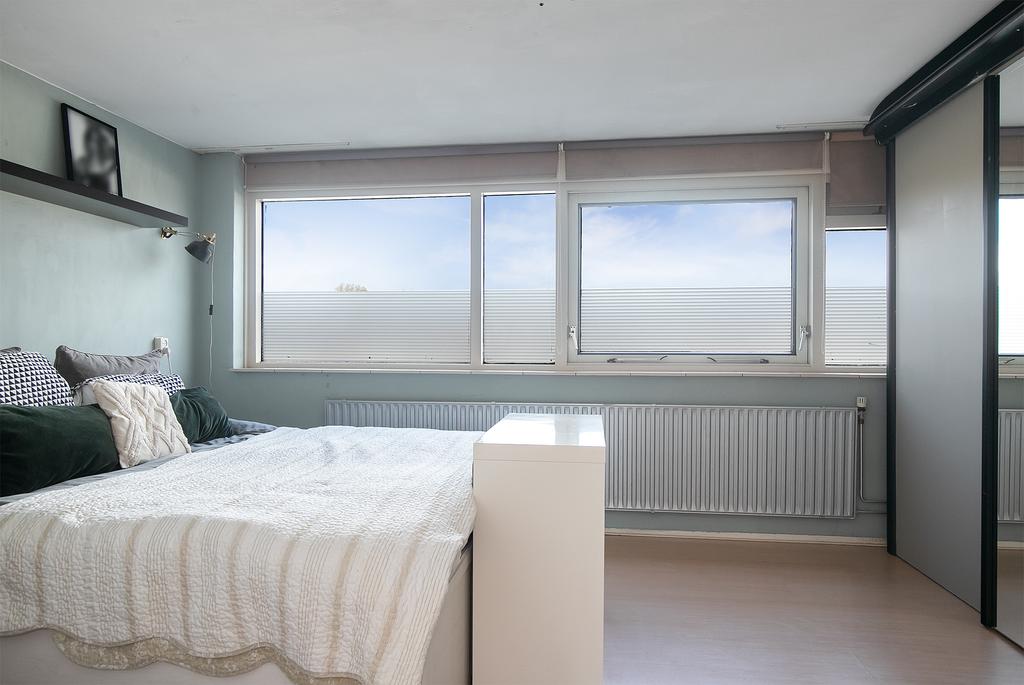 The landing leads to the gem of this house; a large living-kitchen over the entire floor. The kitchen is equipped with a large kitchen island, extractor hood, luxury gas hob, oven, microwave, dishwasher and kitchen mixer tap with spray head. Next to the kitchen island there is room for a large dining table for at least 8 people. The whole is illuminated by the large windows spanning the entire width of the front of the house. Here is also access to the first roof terrace. The seating area is at the back of the floor. Here there is room for a large sofa with room for all your friends and family. On the other side of the room of almost 4.5 m (!) you can easily accommodate a television screen of any size. Windows have also been placed at the entire rear of the floor, providing natural lighting. The French doors give access to the second roof terrace, which overlooks the private backyard.
