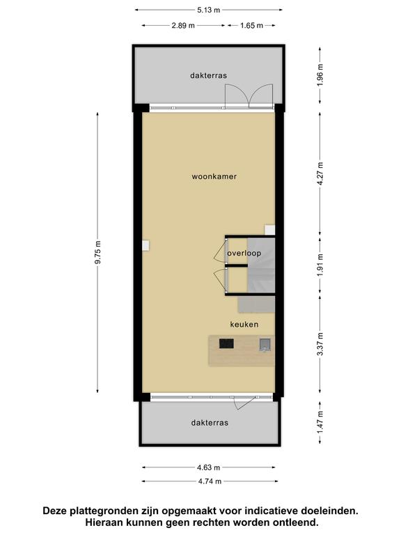 De overloop leidt naar het pareltje van dit huis; een grote woon-leef keuken over de gehele etage. De keuken is voorzien van een groot keukeneiland, afzuigkap, luxe 5-pit gaspitkookplaat, oven, magnetron, inbouw koffiezetapparaat, vaatwasser en keukenmengkraan met sproeikop. Naast het keukeneiland is ruimte voor een grote eettafel voor minstens 8 personen. Het geheel is verlicht door de grote raampartij over de gehele breedte van de voorkant van het huis. Hier is tevens de toegang tot het eerste dakterras. Aan de achterkant van de verdieping is het zitgedeelte. Hier is plek voor een grote bank met plek voor al je vrienden en familie. Aan de andere zijde van de kamer van bijna 4,5m (!) kun je met gemak een televisiescherm van elk gewenst formaat kwijt. Aan de gehele achterzijde van de verdieping zijn tevens ramen geplaatst, waardoor het geheel natuurlijk verlicht wordt. De openslaande deuren geven toegang tot het tweede dakterras, die uitkijkt op de eigen achtertuin.