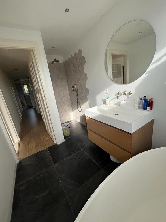 Via de trap komt u op de overloop van de eerste verdieping. Aan uw linkerzijde treft u eerst een inbouwkast met wasmachine en droger. De volgende deur leidt naar het tweede separaat toilet. Als u de gang vervolgt, bereikt u de badkamer met een groot vrijstaand ligbad, inloopdouche met regendouche en een brede wastafel met meubel. De badkamer ligt aan de tuinzijde. Slaapkamer één, is de master. Ruim en voorzien van sfeervolle spotverlichting en openslaande deuren naar het balkon. Slaapkamer twee en drie zijn eveneens ruim. Slaapkamer drie bevindt zich aan de voorzijde van de woning, maar dankzij goede isolatie is er geen geluidsoverlast door passerend verkeer. De laatste kamer op deze etage is een inloopkast.