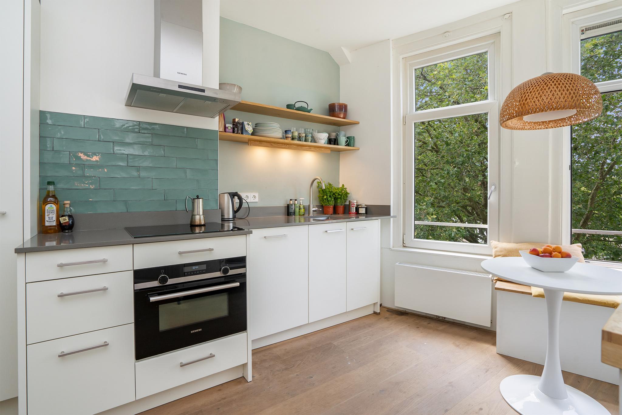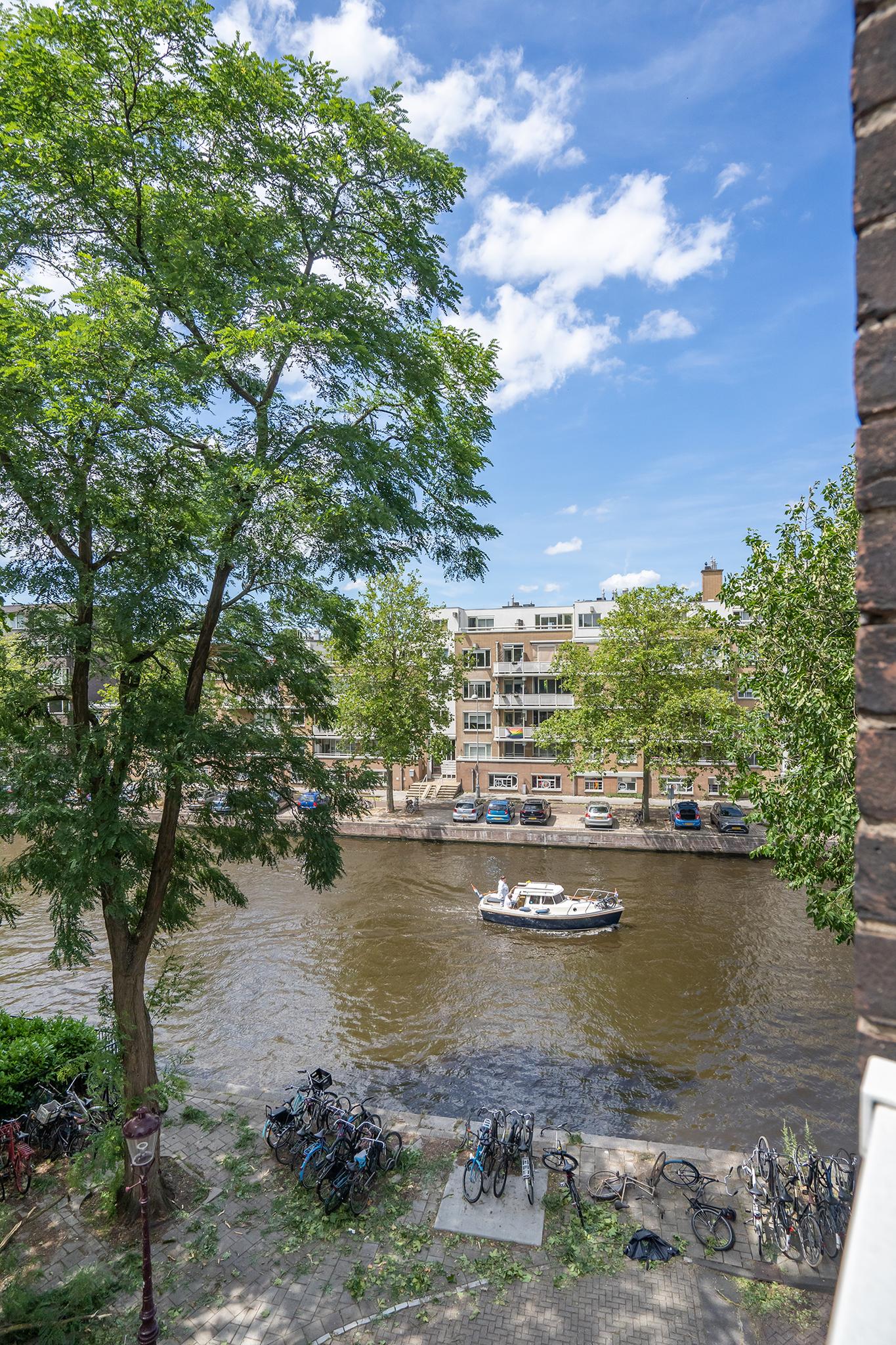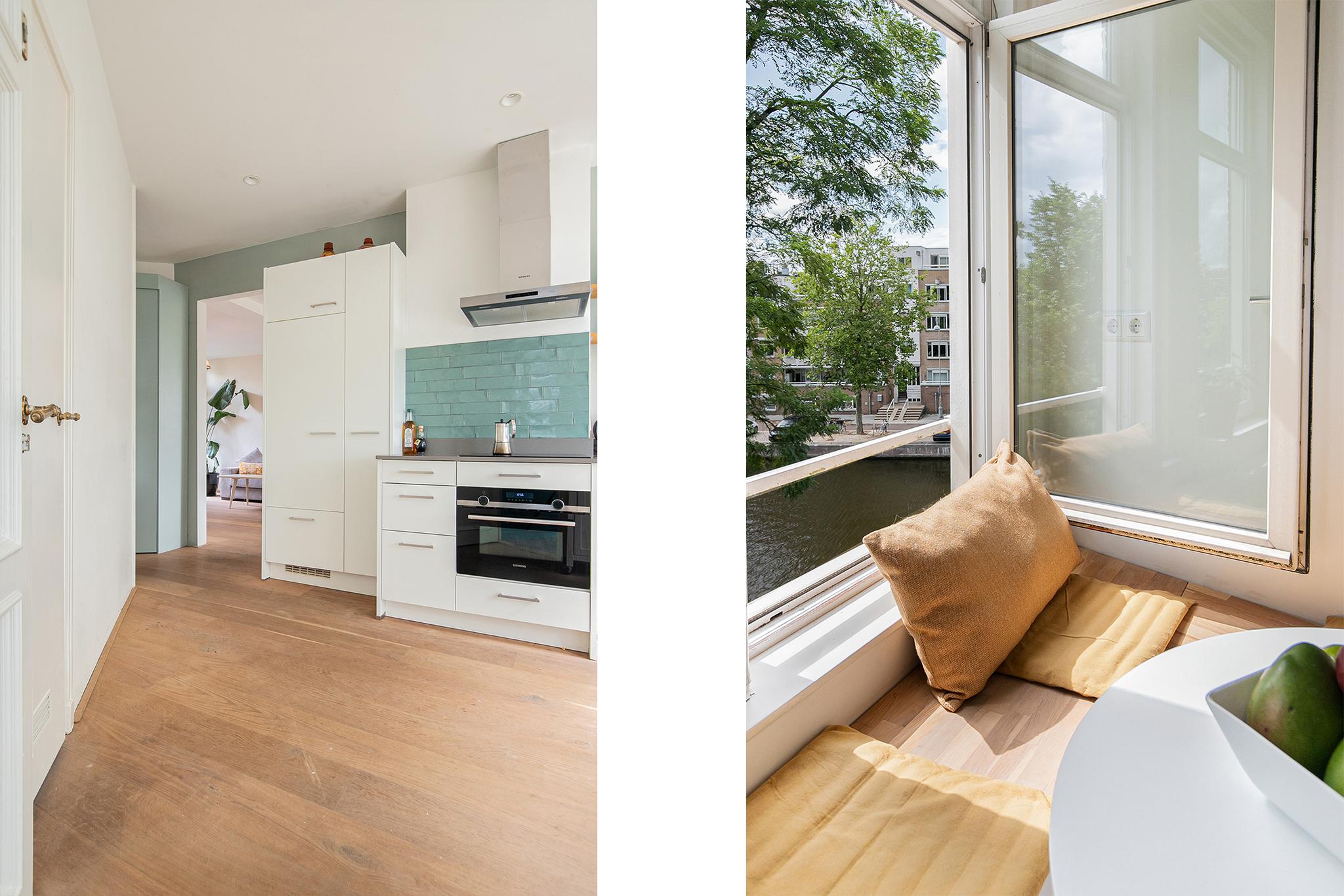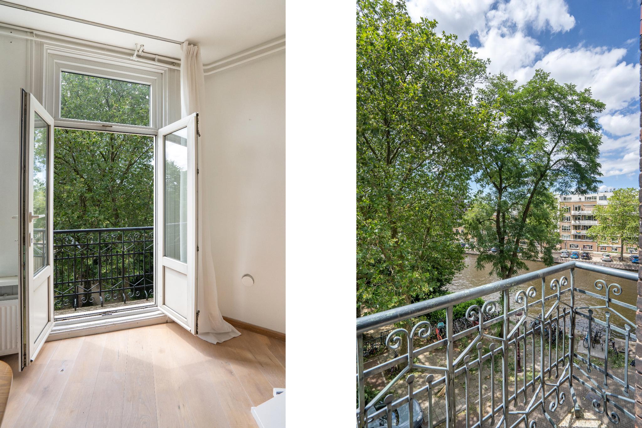 A wonderfully light corner apartment in one of the most beautiful (destination traffic only) streets of Oud West. Approximately 78 m2 of living space, unobstructed view over waterway and park from both the luxurious and cozy kitchen and from the spacious living room. Two balconies at the front and rear with beautiful views. Beautiful recently renovated bathroom, a light oak floor on both floors and two spacious and quietly located bedrooms. The light from sunrise to sunset and privacy in all rooms of this apartment, offer you a unique living comfort in the middle of the lively Old West.