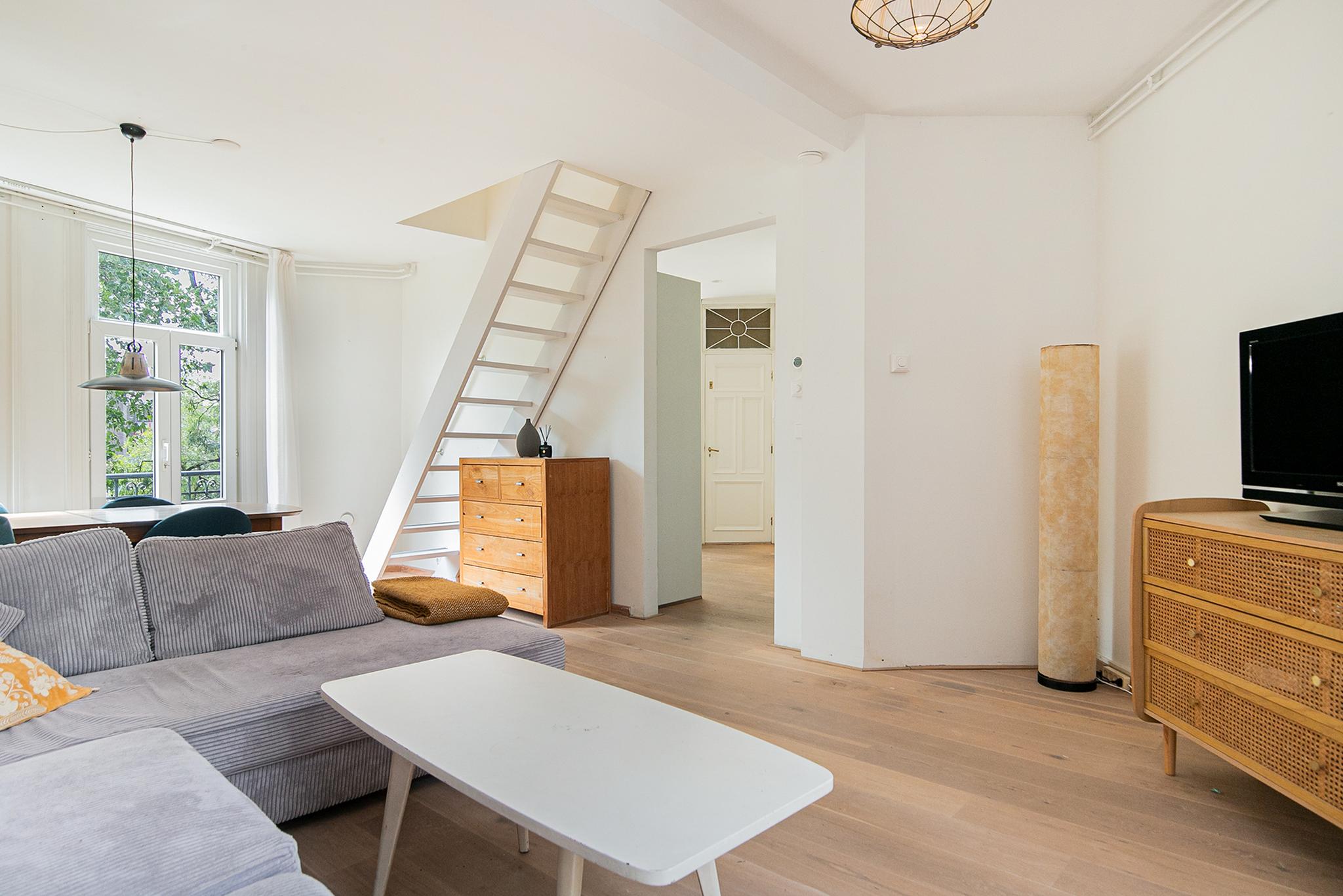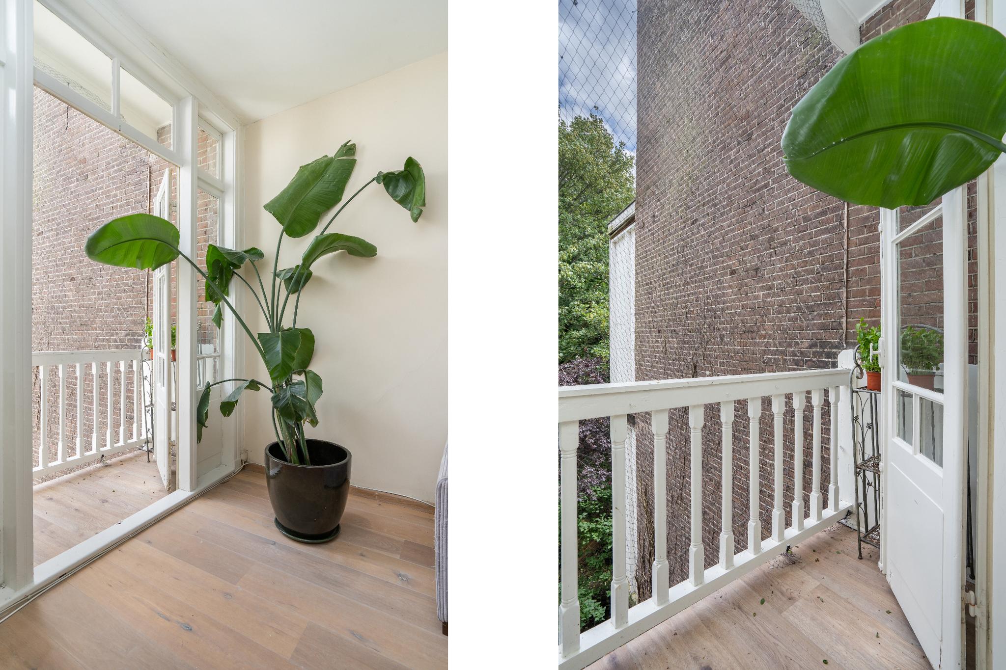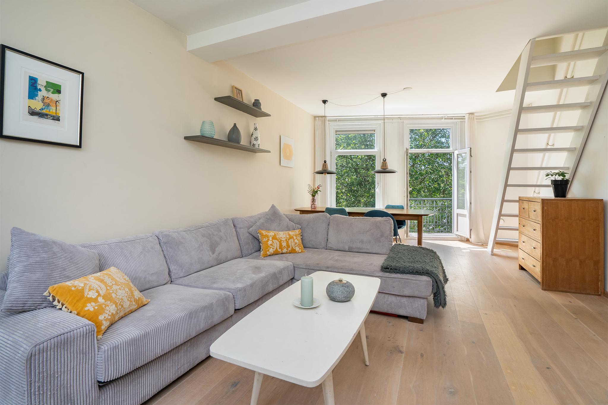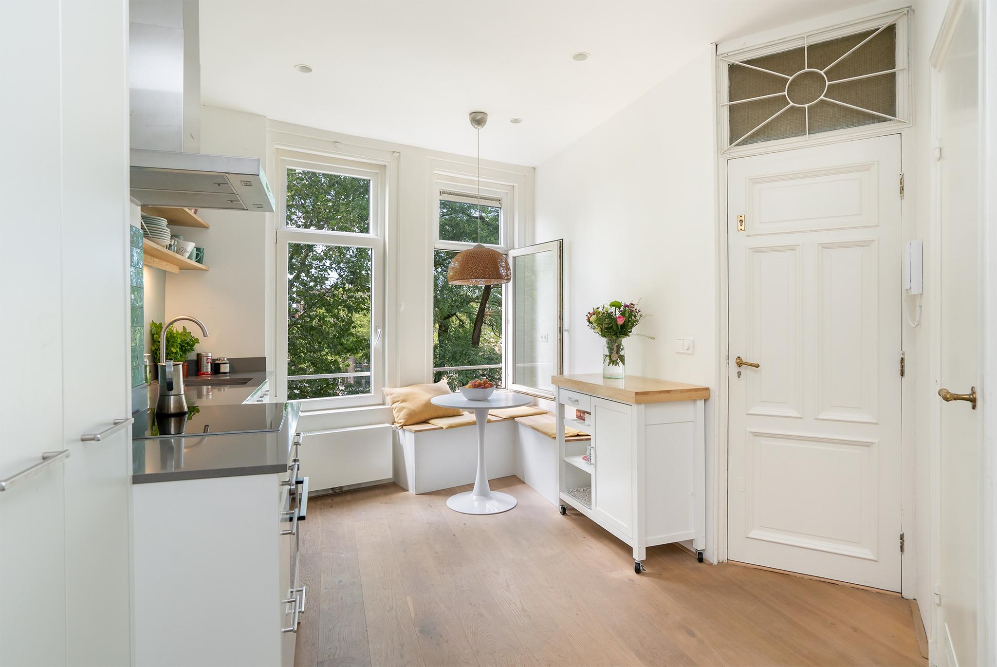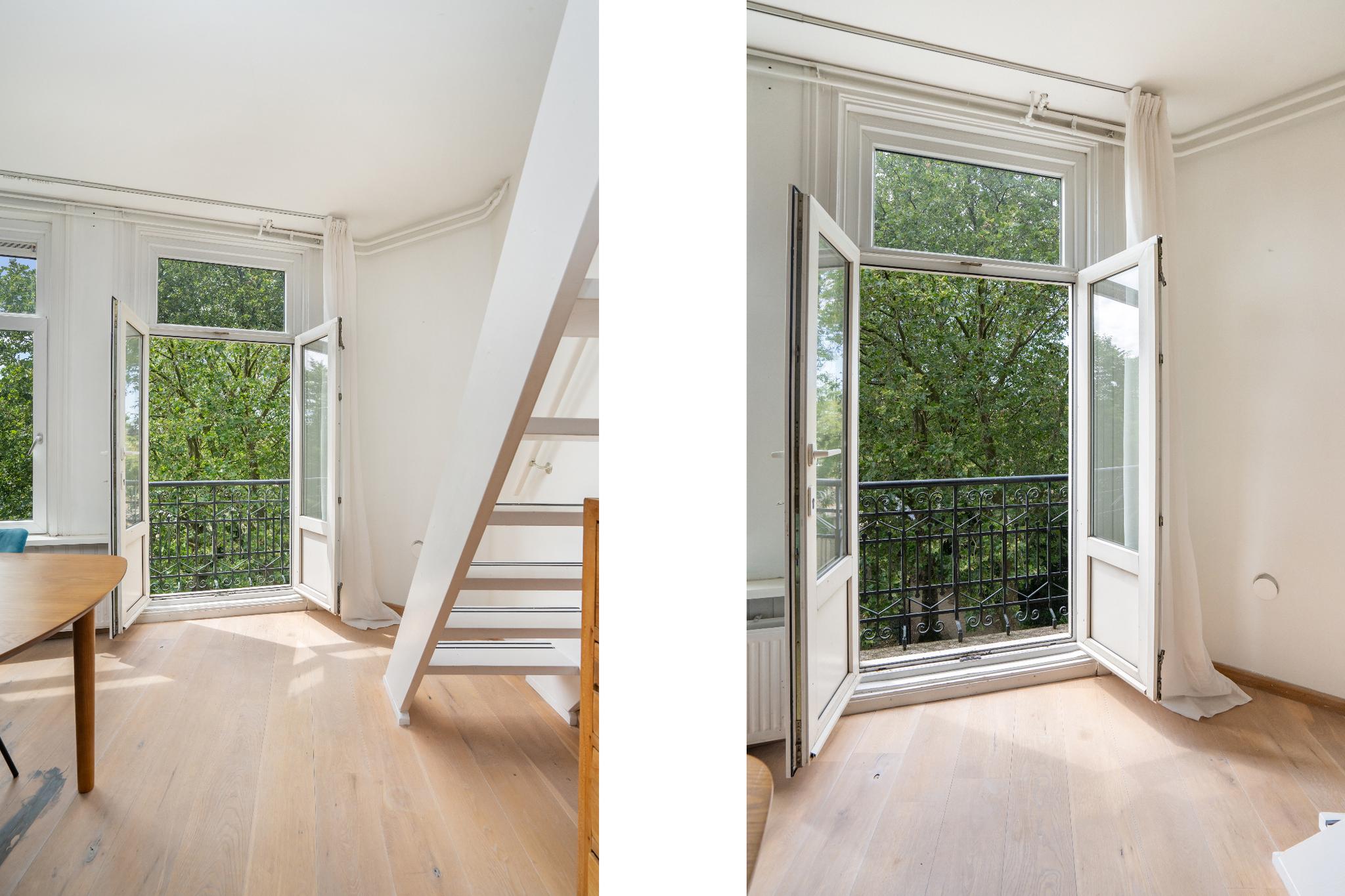 A wonderfully light corner apartment in one of the most beautiful (destination traffic only) streets of Oud West. Approximately 78 m2 of living space, unobstructed view over waterway and park from both the luxurious and cozy kitchen and from the spacious living room. Two balconies at the front and rear with beautiful views. Beautiful recently renovated bathroom, a light oak floor on both floors and two spacious and quietly located bedrooms. The light from sunrise to sunset and privacy in all rooms of this apartment, offer you a unique living comfort in the middle of the lively Old West.