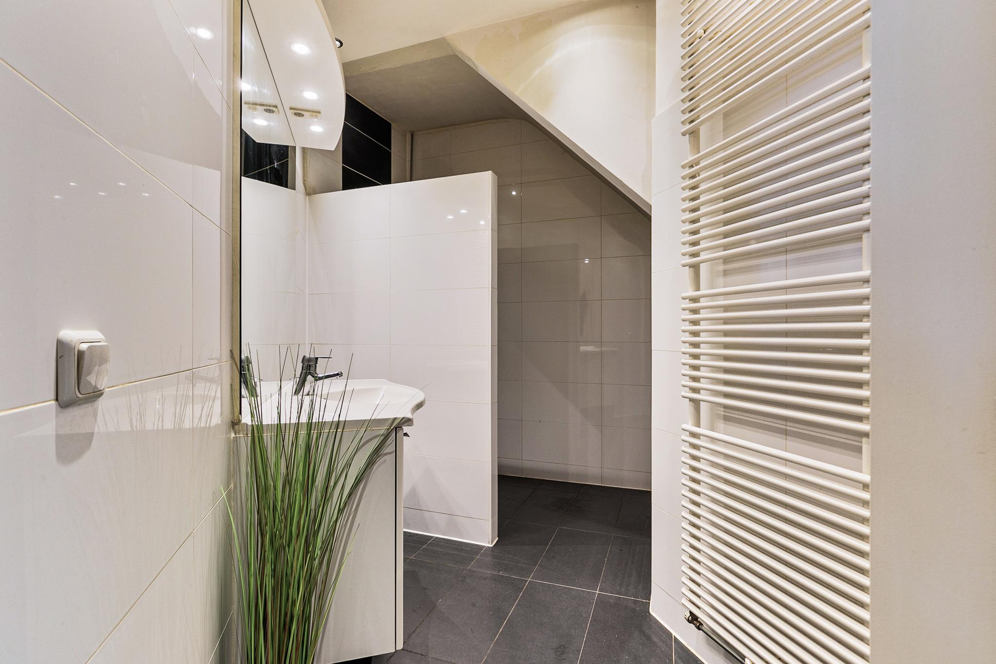 Directly adjacent to the hall you will find the spacious bathroom. This is fully tiled with floor and wall tiles, which ensures a neat appearance. The walk-in shower is spacious and the bathroom is also equipped with a sink with mirror and a towel radiator. This makes the bathroom ready to move in.